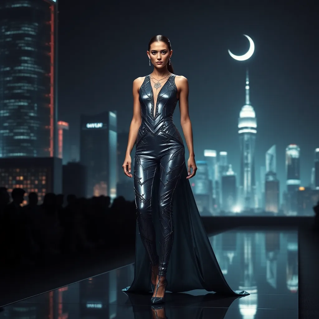 Create a futuristic, high-fashion runway scene featuring a stunning model wearing a sleek, metallic jumpsuit with intricate details and a dramatic train. The background is a dark, neon-lit cityscape with towering skyscrapers and a crescent moon glowing in the sky. The overall mood is edgy, glamorous, and otherworldly.