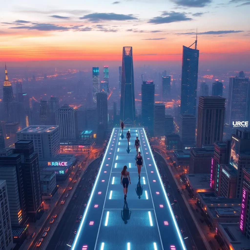 Create a futuristic cityscape at dusk with a sprawling metropolis, neon-lit skyscrapers, and a bustling street scene. Incorporate a sleek, high-fashion runway stretching across the city, with models strutting down it in avant-garde outfits, surrounded by holographic lights and futuristic architecture.