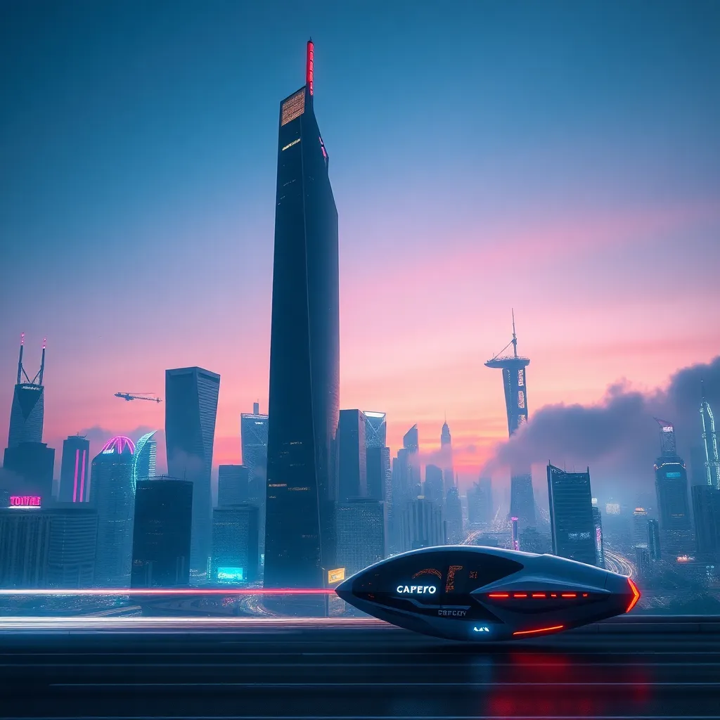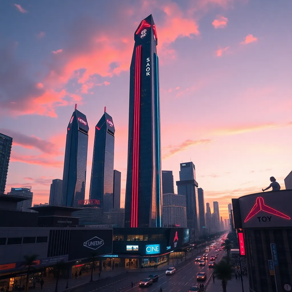 Create a futuristic cityscape at sunset, with a sleek, high-tech skyscraper as the centerpiece. Incorporate neon lights, towering skyscrapers, and a bustling street scene. Add a few flying cars and a holographic billboard to complete the futuristic atmosphere. The sky should be painted with hues of pink, orange, and purple.