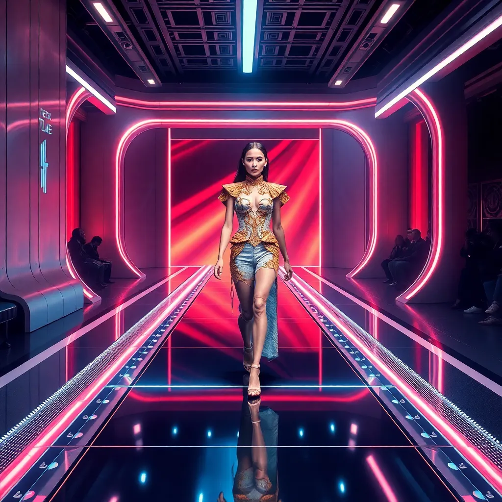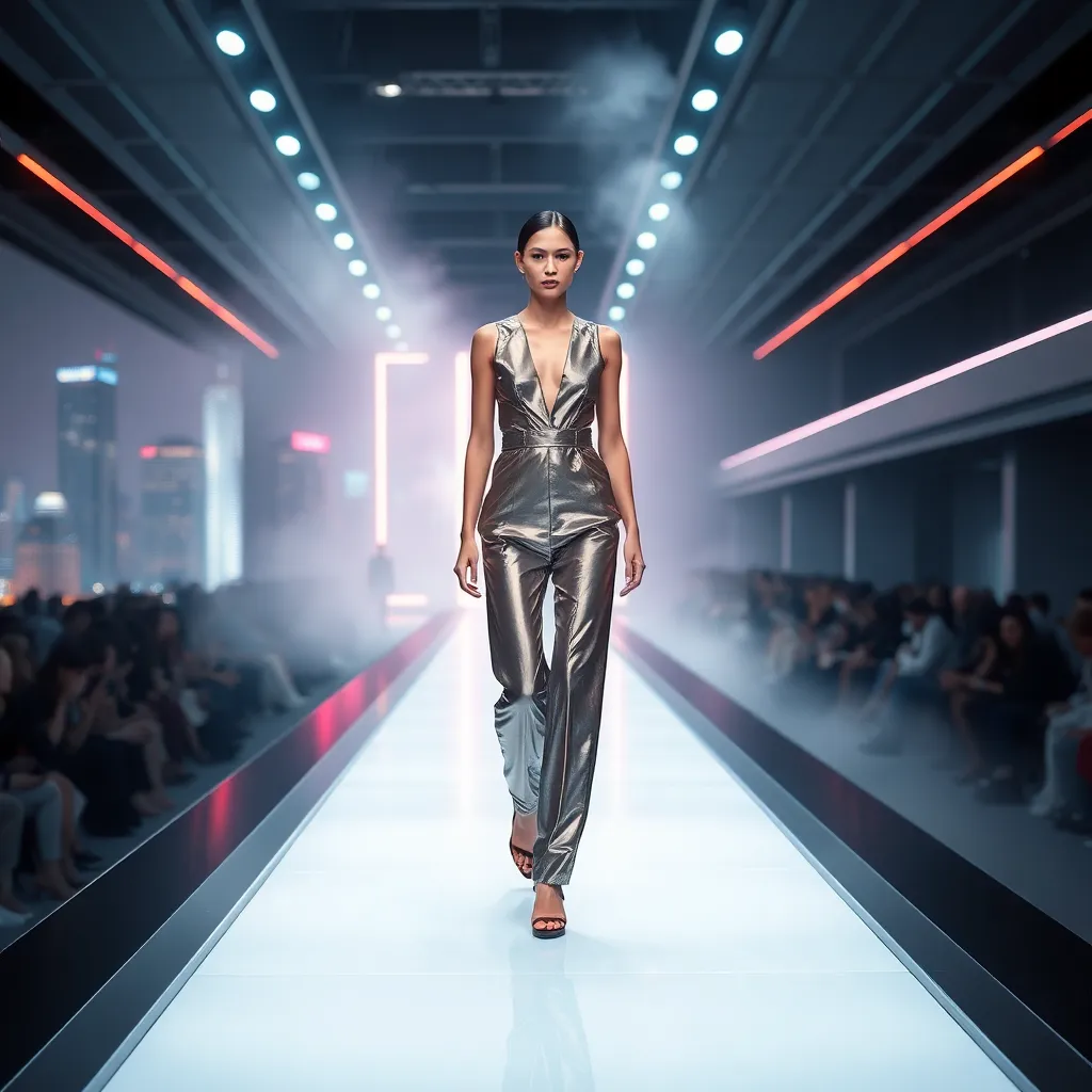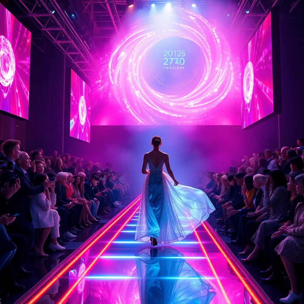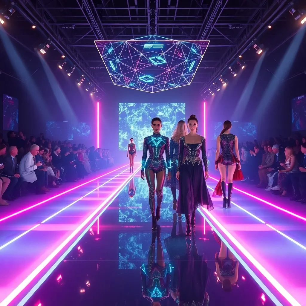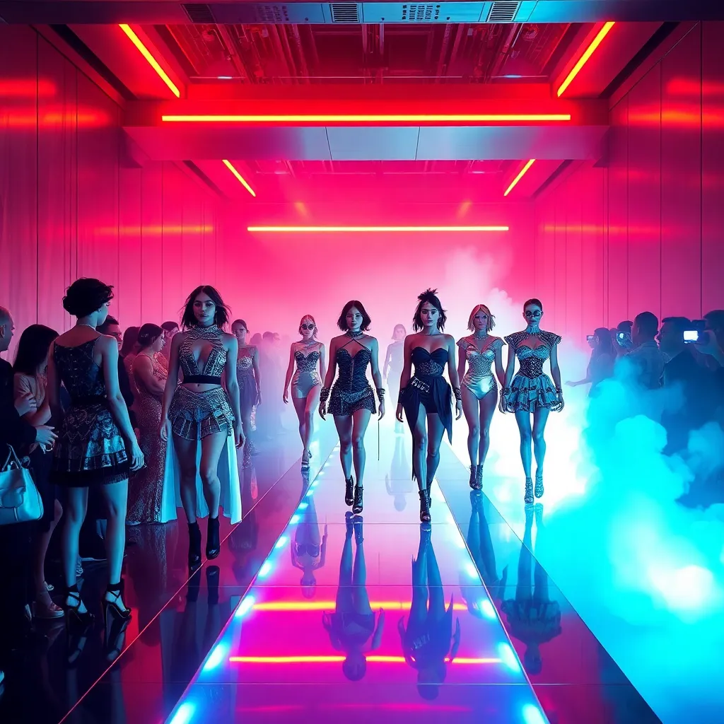 Create a futuristic runway scene with a bold, neon-lit catwalk stretching into the distance. A sleek, high-tech fashion show is underway, with models showcasing avant-garde, metallic outfits adorned with glowing accents. The atmosphere is electric, with a mesmerizing holographic display hovering above the crowd.