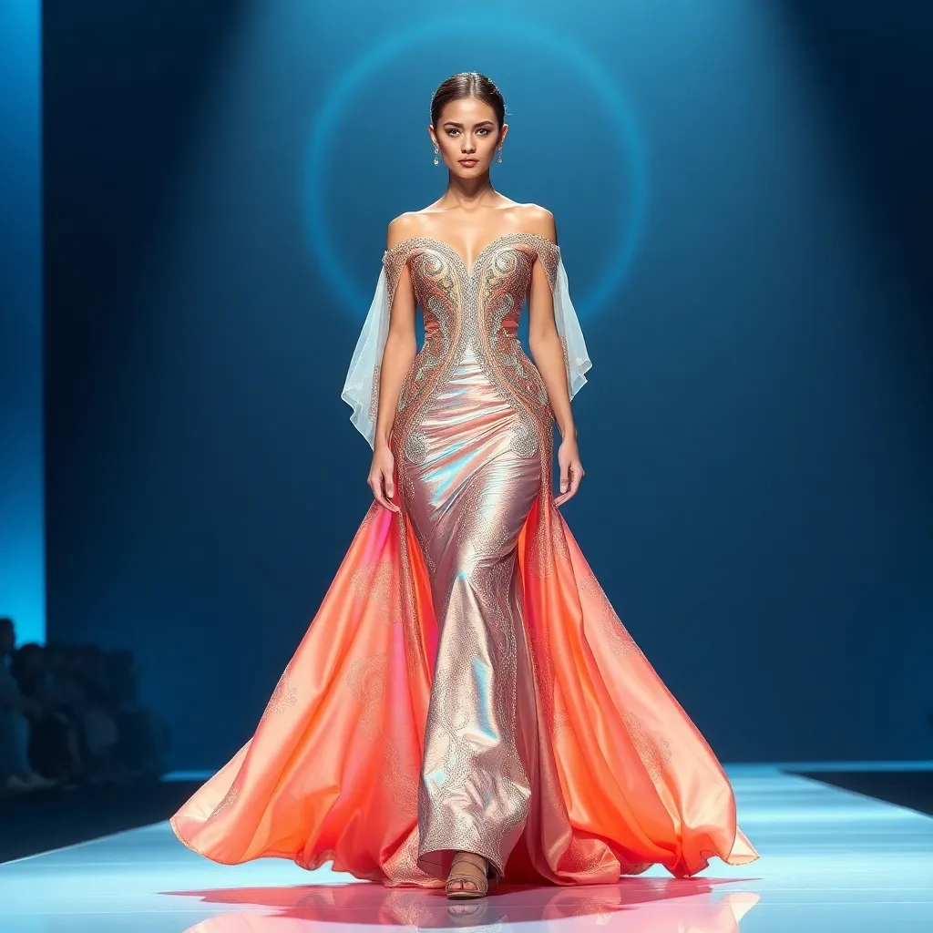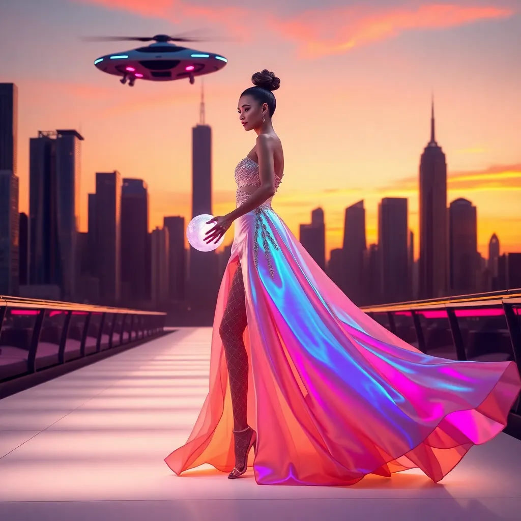Design a futuristic high-fashion runway scene featuring a stunning model in a flowing, iridescent gown with intricate neon accents. The background is a cityscape at sunset, with sleek skyscrapers and a futuristic hovercar hovering above. The model's hair is styled in a chic updo, and she's holding a glowing orb.