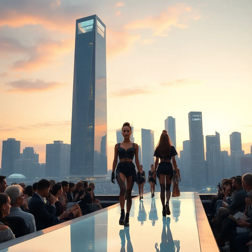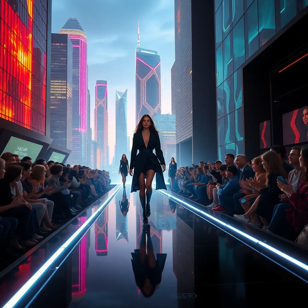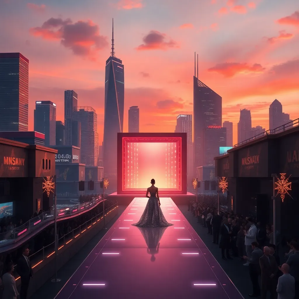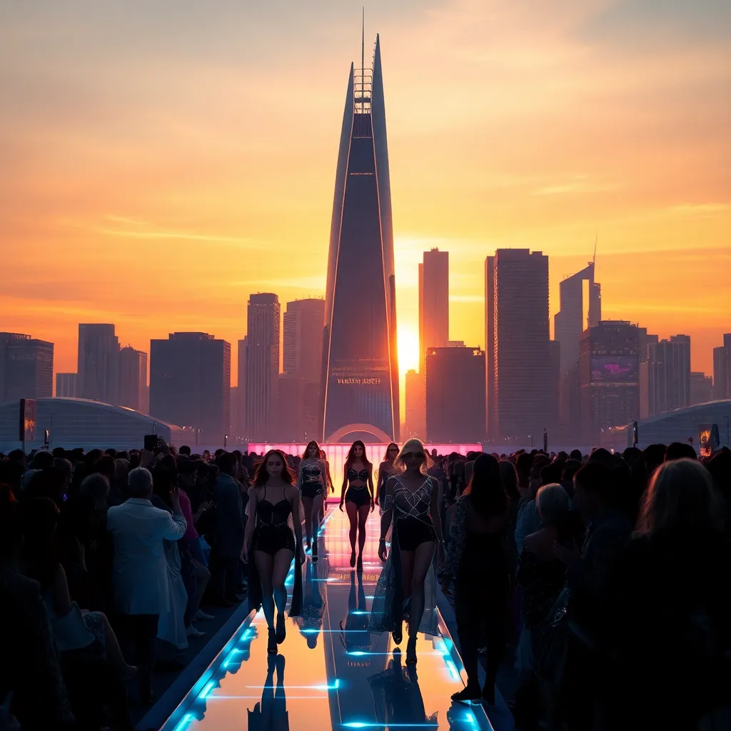 Imagine a futuristic cityscape at sunset, with a sleek and modern skyscraper serving as the backdrop for a luxurious, high-fashion runway show. Models strut down the catwalk in avant-garde, neon-lit outfits, surrounded by a mesmerizing glow of holographic lights and a crowd of avant-garde, futuristic fashionistas.
