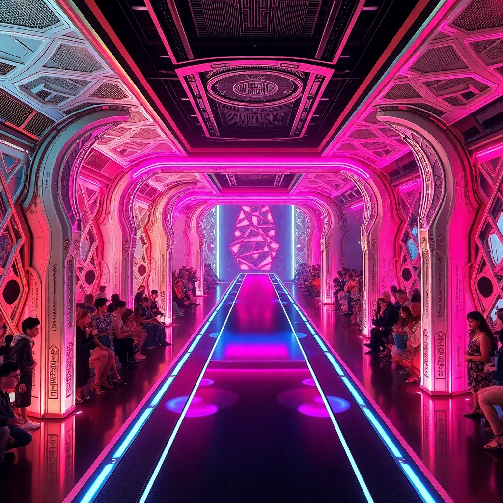 Design a futuristic runway with a blend of modern and retro elements. Incorporate neon lights, metallic accents, and intricate patterns. A sleek, high-tech catwalk stretches into the distance, surrounded by a crowd of fashion-forward attendees. The atmosphere is electric, with pulsing music and a sense of excitement and anticipation.