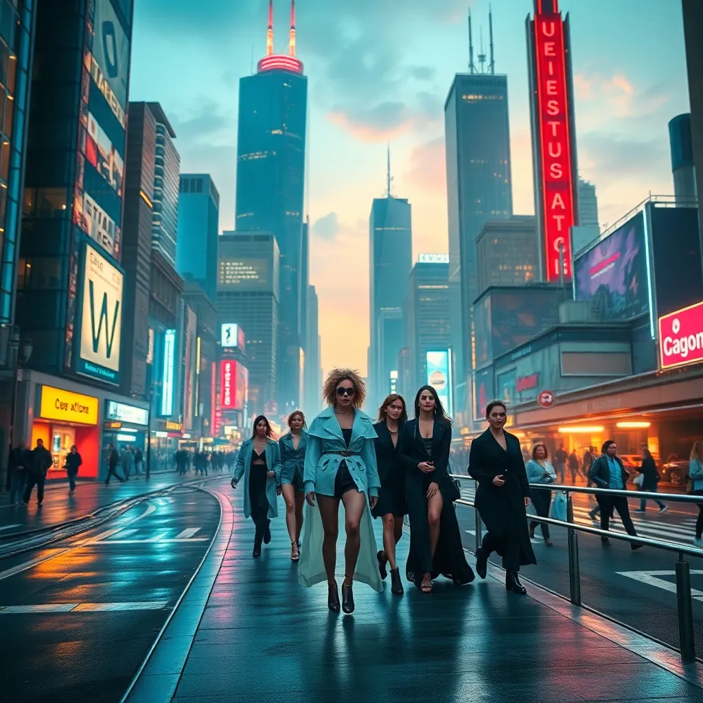 Imagine a futuristic cityscape at dusk, with towering skyscrapers and neon lights reflecting off the wet pavement. A group of fashion-forward individuals, dressed in avant-garde attire, strut down a catwalk that winds its way through the city streets. The air is electric with excitement and anticipation.