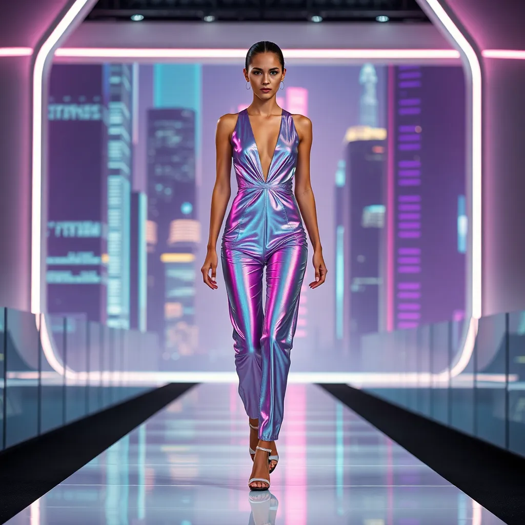 Create a futuristic fashion runway scene with a neon-lit catwalk, sleek skyscrapers, and a crowd of stylish onlookers. A model in a stunning, iridescent jumpsuit is walking down the runway, surrounded by holographic projections and strobe lights. Incorporate metallic accents, flowing fabrics, and a sense of high-tech glamour.