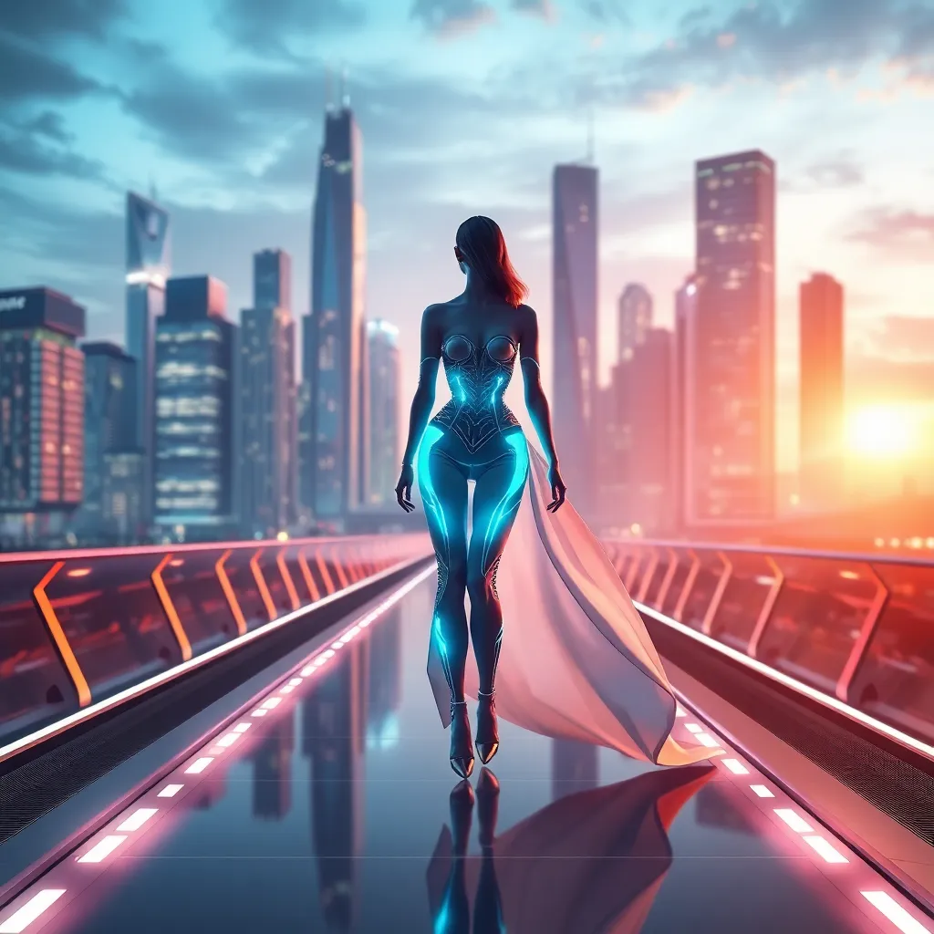 Design a futuristic catwalk scene where a stunning model walks down the runway in a glamorous, iridescent jumpsuit. The backdrop is a cityscape at sunset, with towering skyscrapers and a vibrant orange sky. The model's hair is styled in a sleek updo, and she's accessorized with a bold, geometric necklace.