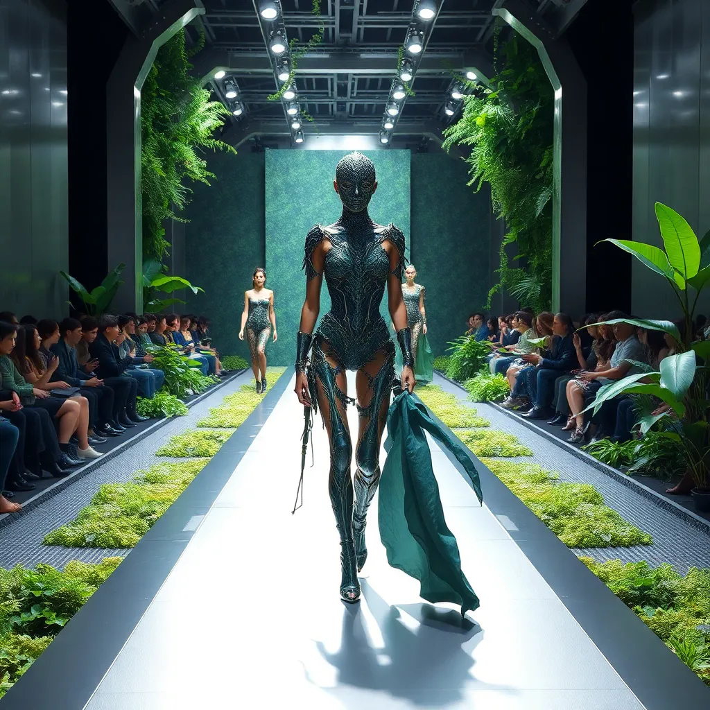 Design a futuristic, high-fashion runway show inspired by the intersection of technology and nature. Imagine a world where humans and machines coexist in harmony. Create a setting that combines sleek metallic surfaces with lush greenery, featuring models dressed in avant-garde outfits that blend organic and synthetic materials.