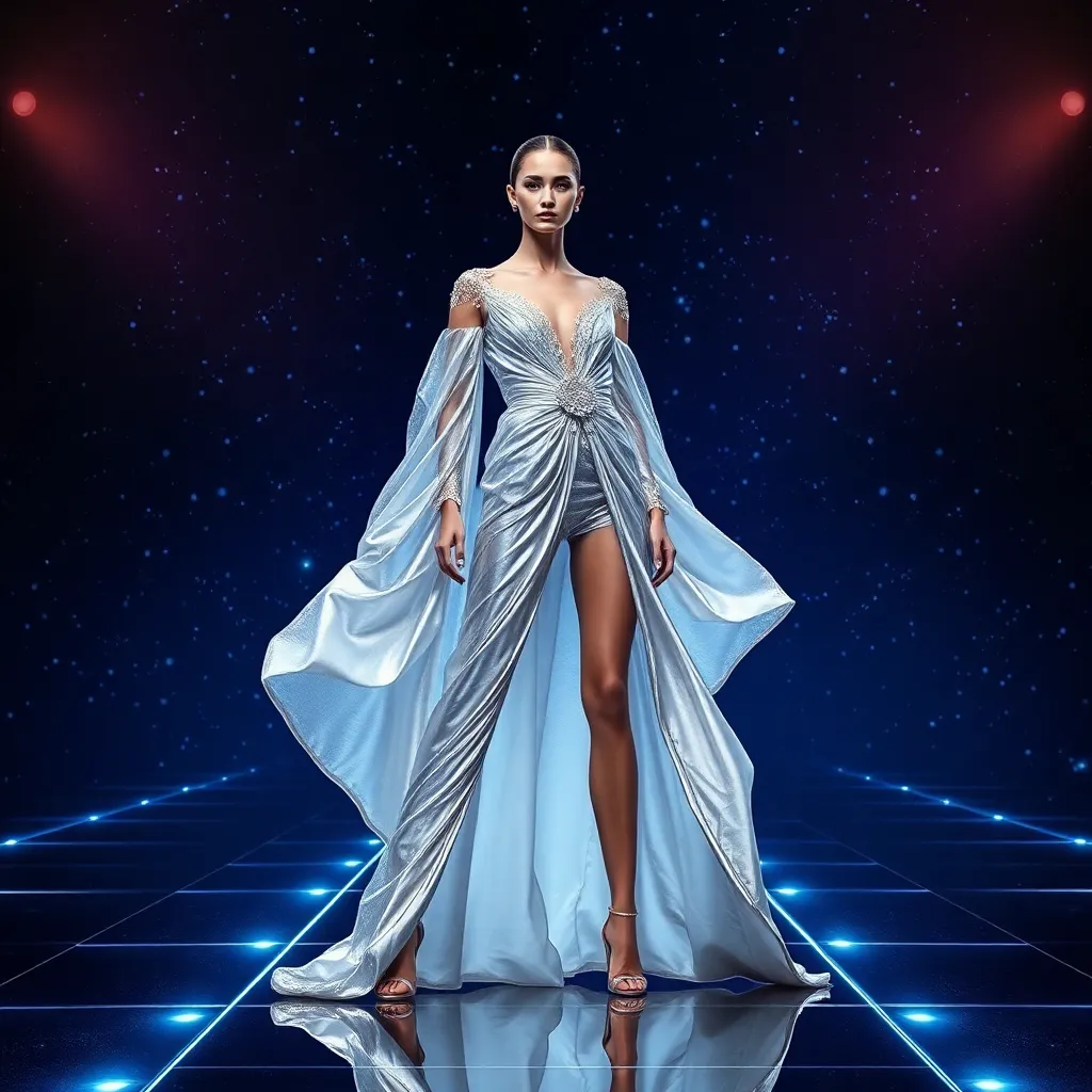 Create an avant-garde fashion design for a futuristic catwalk show. Inspired by the beauty of space, the outfit should feature shimmering metallic fabrics, flowing silhouettes, and intricate details that resemble celestial bodies. The model should strike a pose on a gleaming runway surrounded by a starry night sky backdrop.