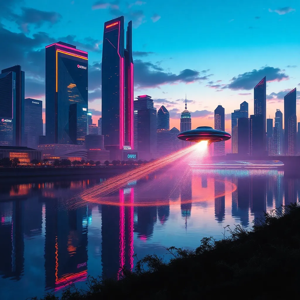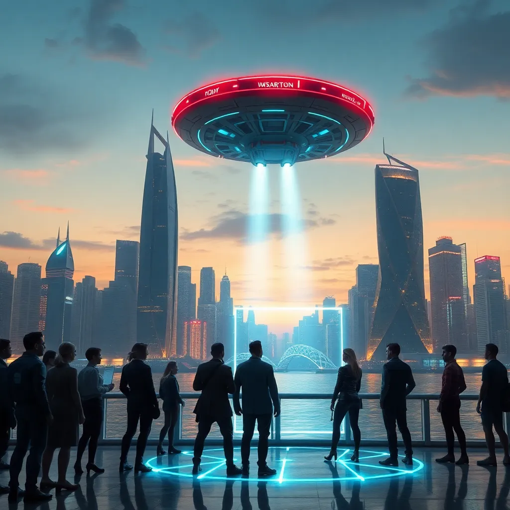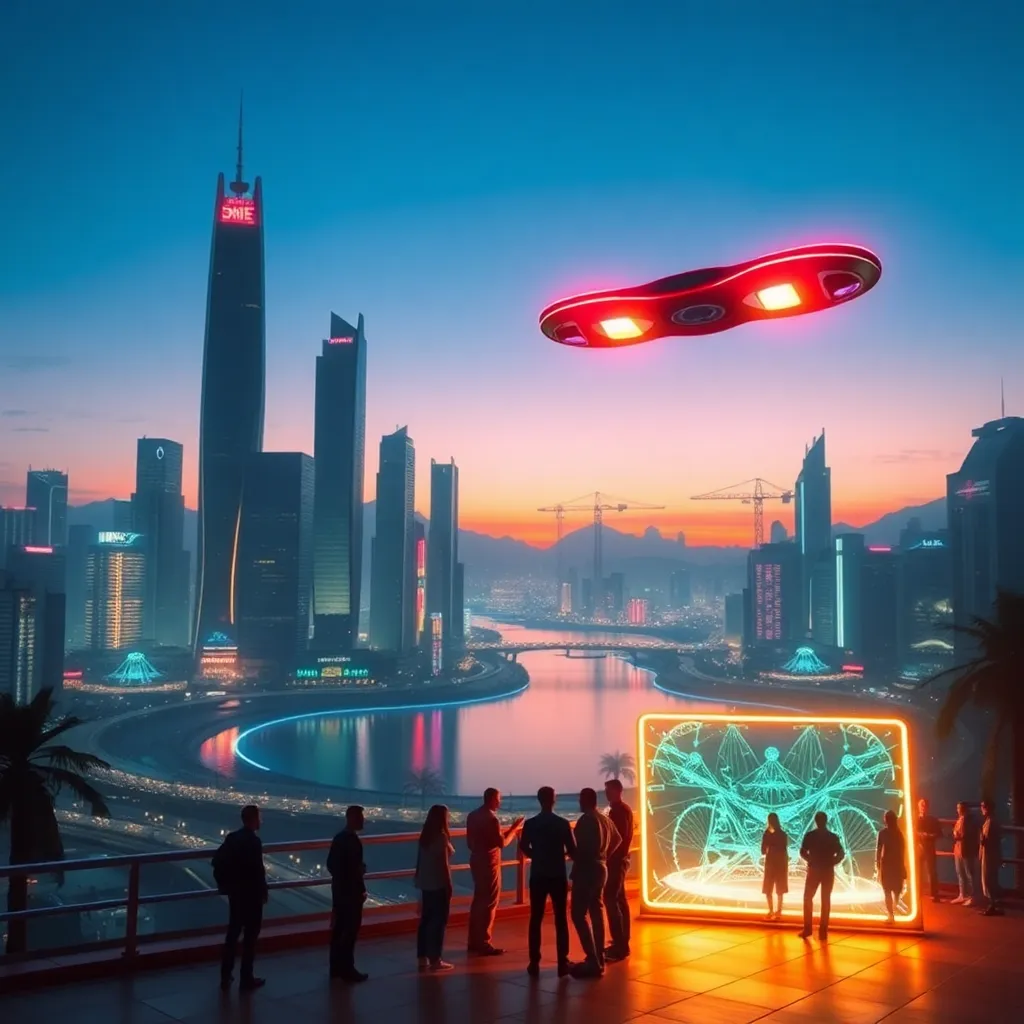 Imagine a futuristic cityscape at sunset, with sleek skyscrapers and neon lights reflecting off the water. A group of people in futuristic attire are gathered around a holographic display, looking up in awe as a massive spaceship descends from the sky. Generate an image that captures this scene in vivid detail.