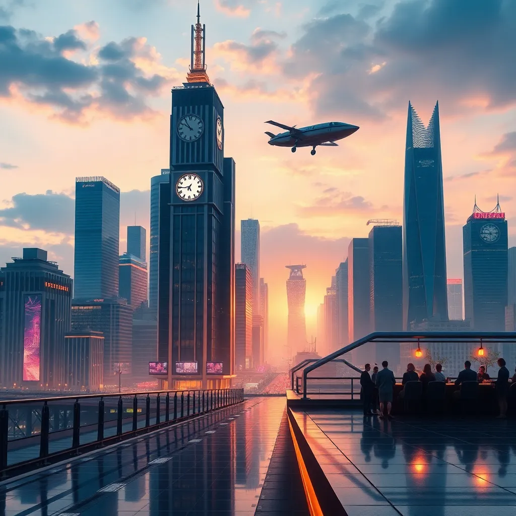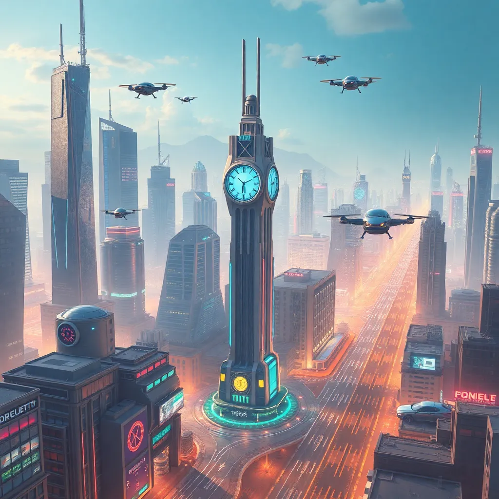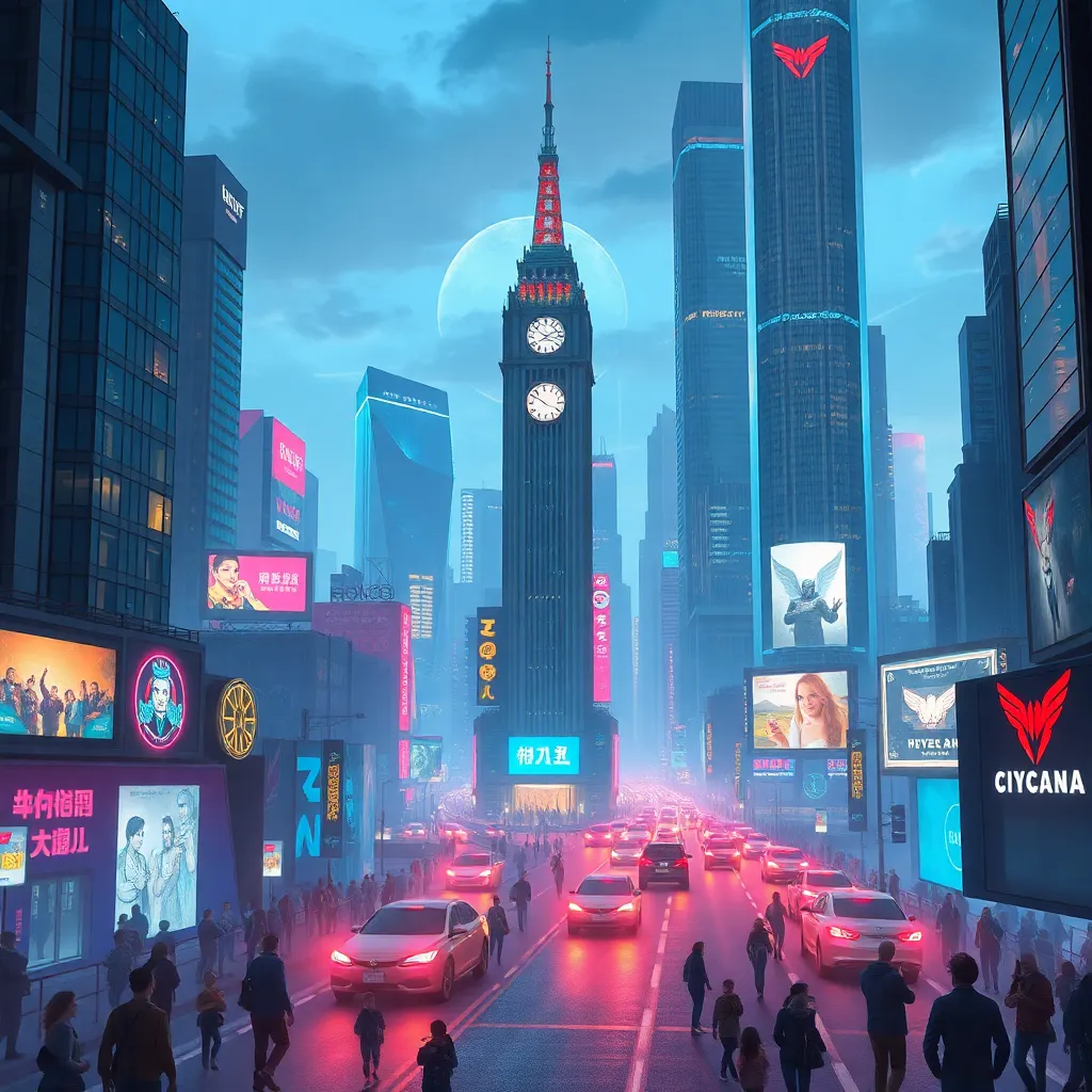 Create a futuristic cityscape with towering skyscrapers and flying cars zipping by. Incorporate neon lights and holographic advertisements. The city should be bustling with people of all ages and backgrounds, showcasing a vibrant and inclusive community. Include a prominent clock tower or iconic landmark.