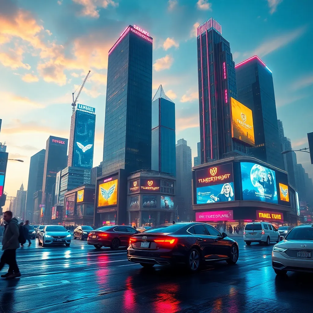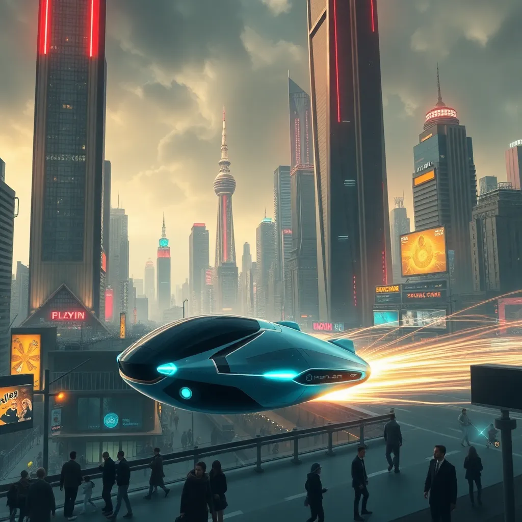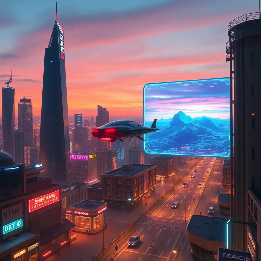 Create an futuristic cityscape at dusk with sleek skyscrapers, neon lights, and a sprawling metropolis. Incorporate a flying car hovering above the city, with a giant holographic screen displaying a futuristic landscape. Include a sense of movement and energy, with people and robots rushing through the streets.