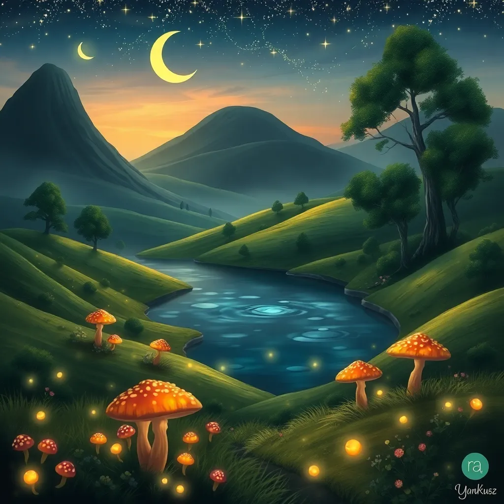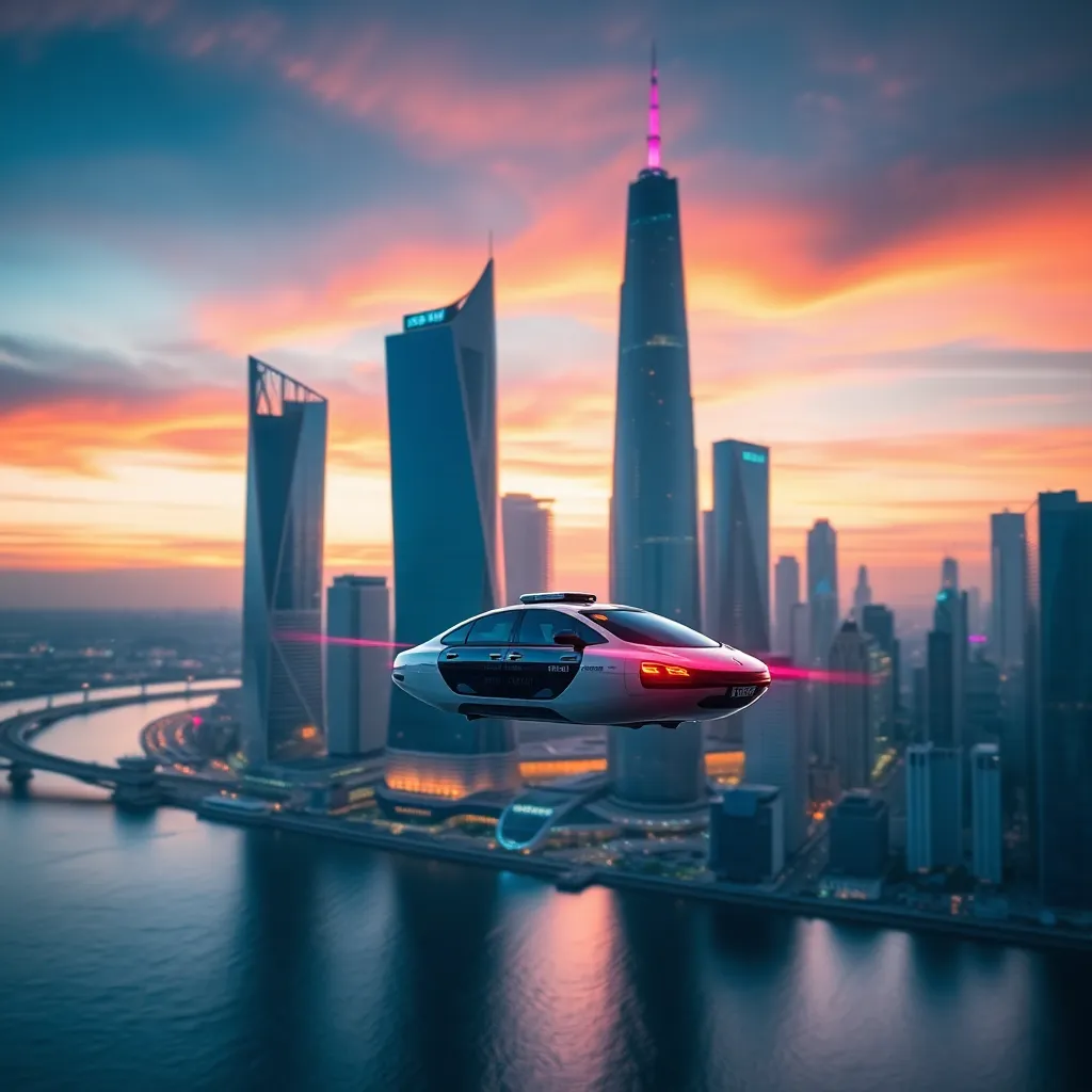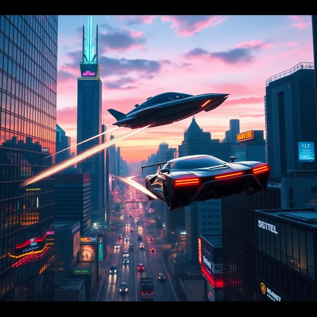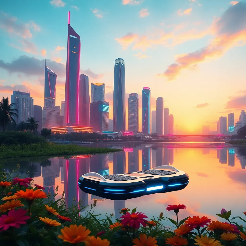 Generate an image of a futuristic cityscape at sunset, with sleek skyscrapers and neon lights reflected in a serene lake. Incorporate a hoverboard or flying car in the foreground, surrounded by lush greenery and vibrant flowers. The atmosphere should be peaceful and futuristic, with a hint of nostalgia.