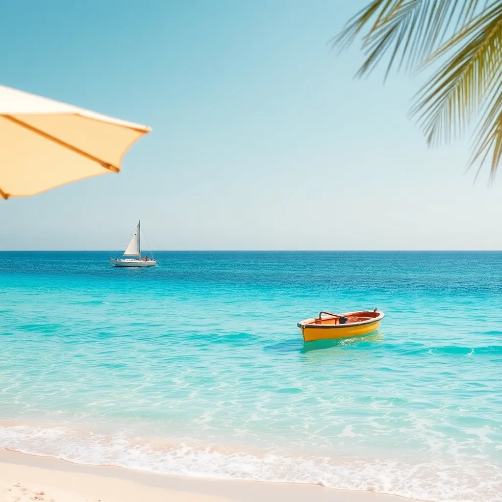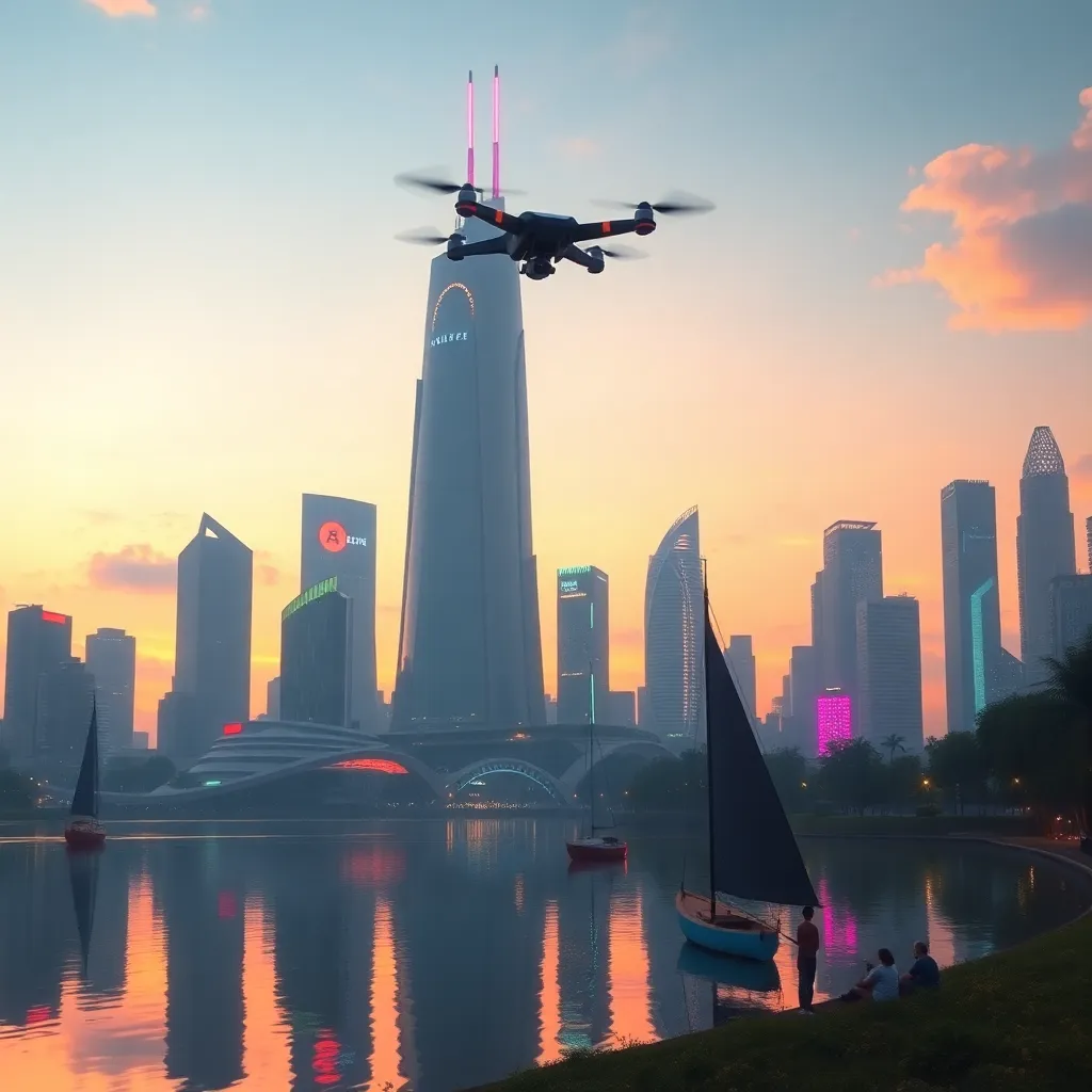 Create a futuristic cityscape at sunset, with sleek skyscrapers and neon lights reflecting off a calm, serene lake. Incorporate a hovering drone, a sailboat, and a few people enjoying the peaceful atmosphere. Use vibrant colors and subtle gradients to capture the warm, magical ambiance of the setting sun.