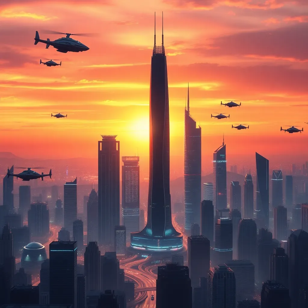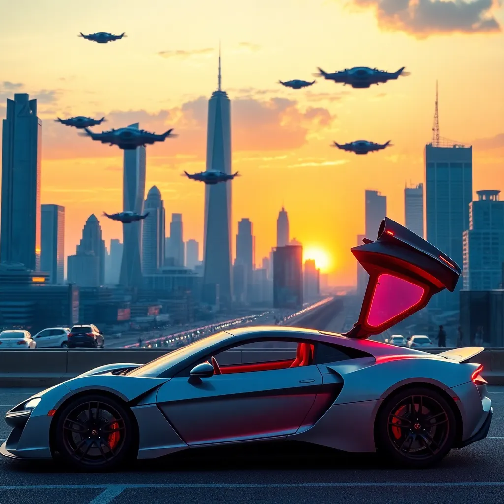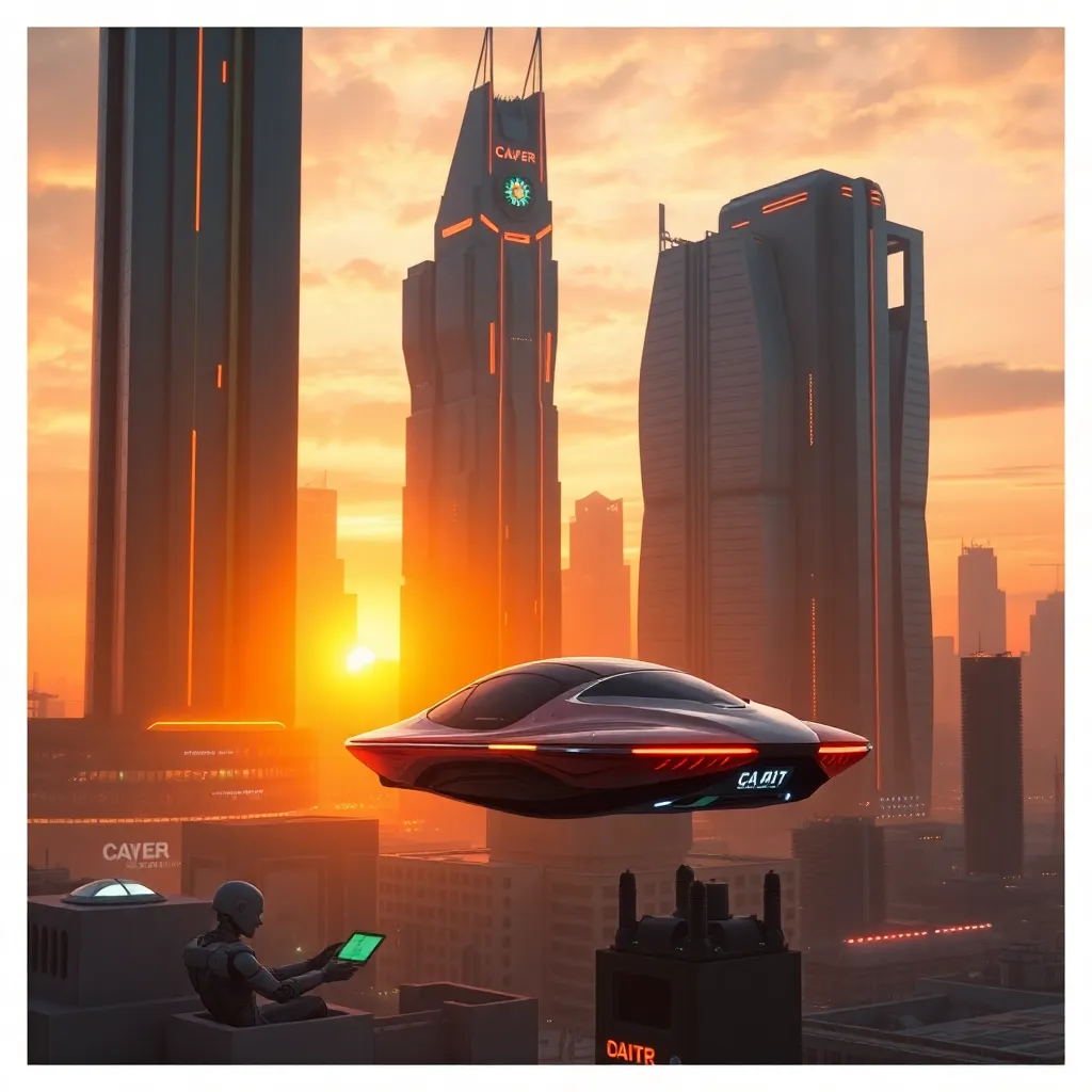 Generate an image of a futuristic cityscape with towering skyscrapers and neon lights. The scene should be set at sunset with a warm orange glow. Incorporate a sleek, high-tech flying car hovering above the city. The background should feature a futuristic landscape with robots and humans coexisting.