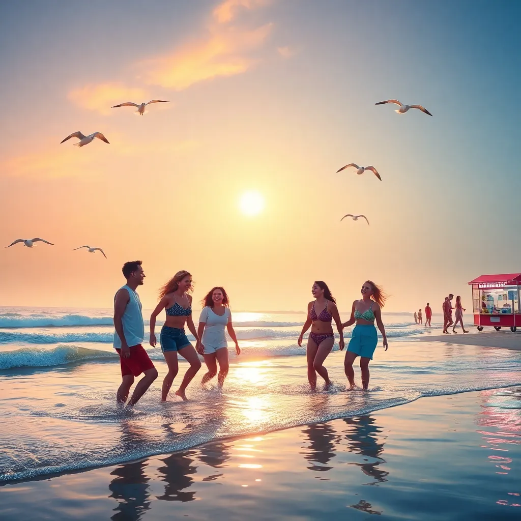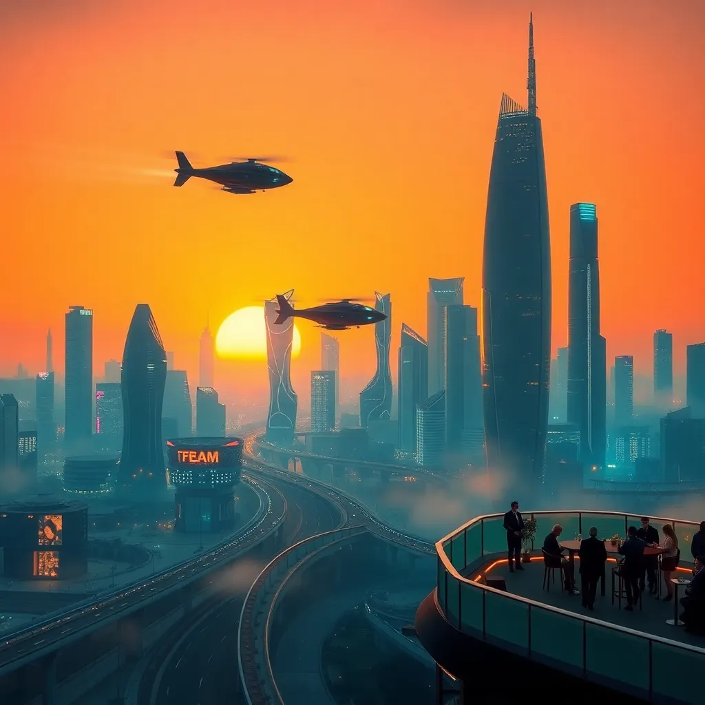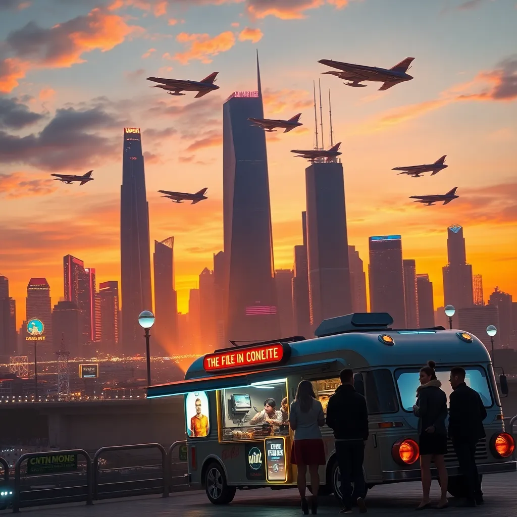 Create a futuristic cityscape at sunset, with sleek skyscrapers and flying cars zipping by. Incorporate neon lights and holographic advertisements. In the foreground, a group of friends in stylish outfits are gathered around a futuristic food truck, enjoying a meal and taking in the breathtaking view.