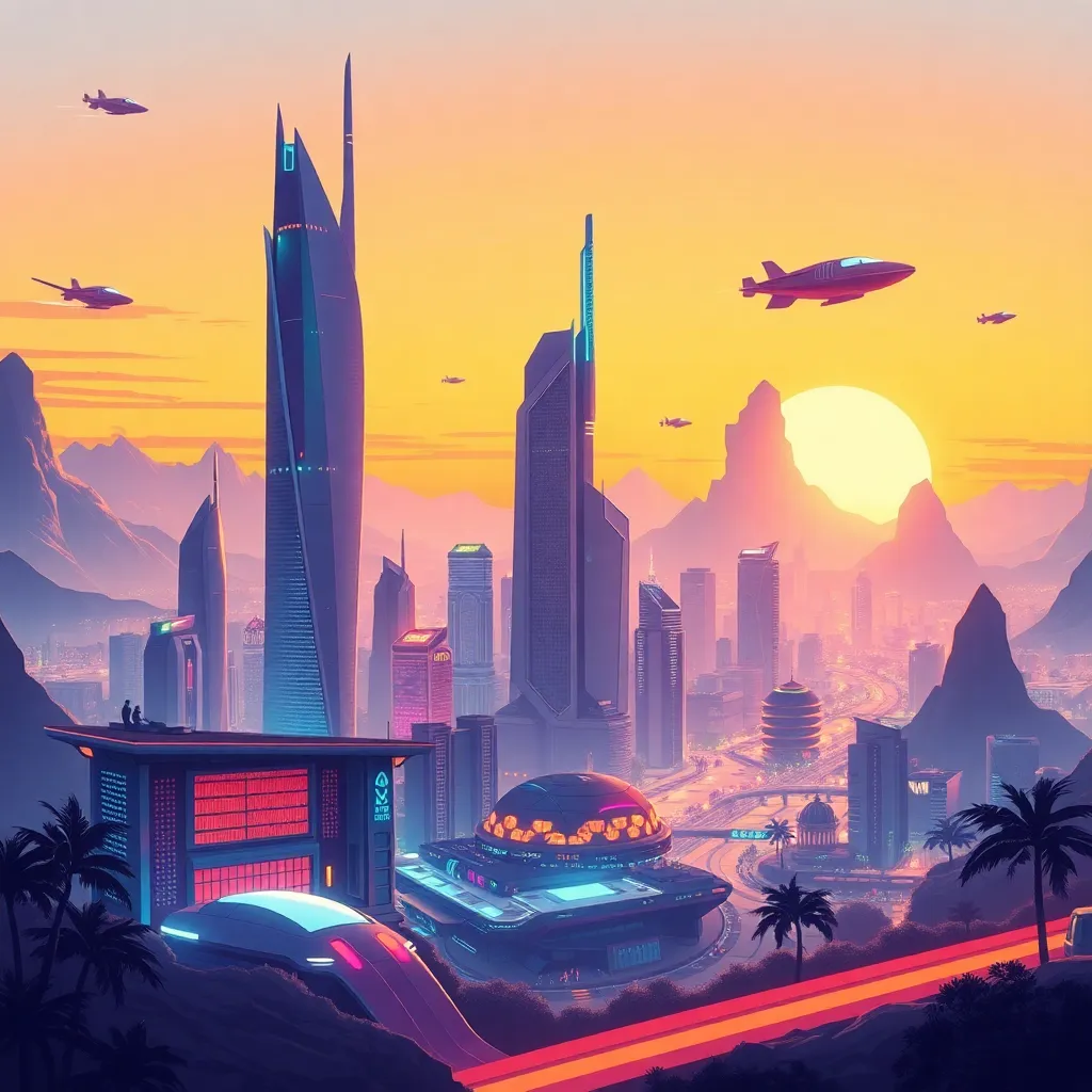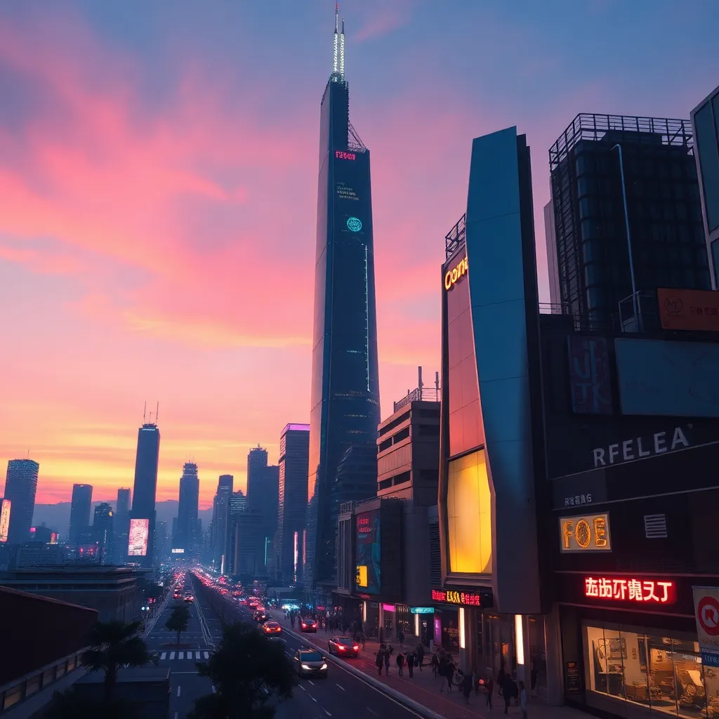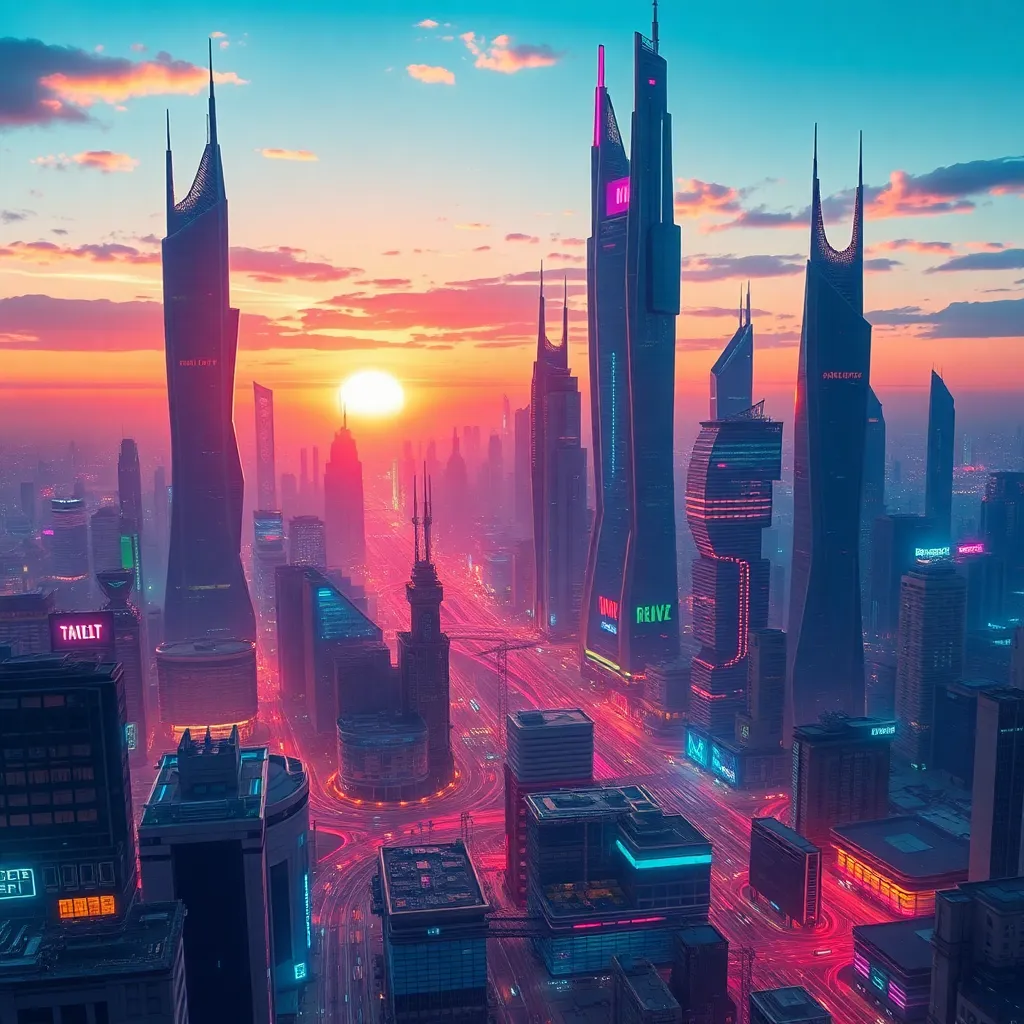 Create an imaginative futuristic cityscape at sunset, with sleek skyscrapers, neon-lit streets, and a sprawling metropolis that blends organic and synthetic elements. Incorporate vibrant colors, intricate details, and a sense of energy and movement. The city should be both futuristic and nostalgic, with a hint of mystique.