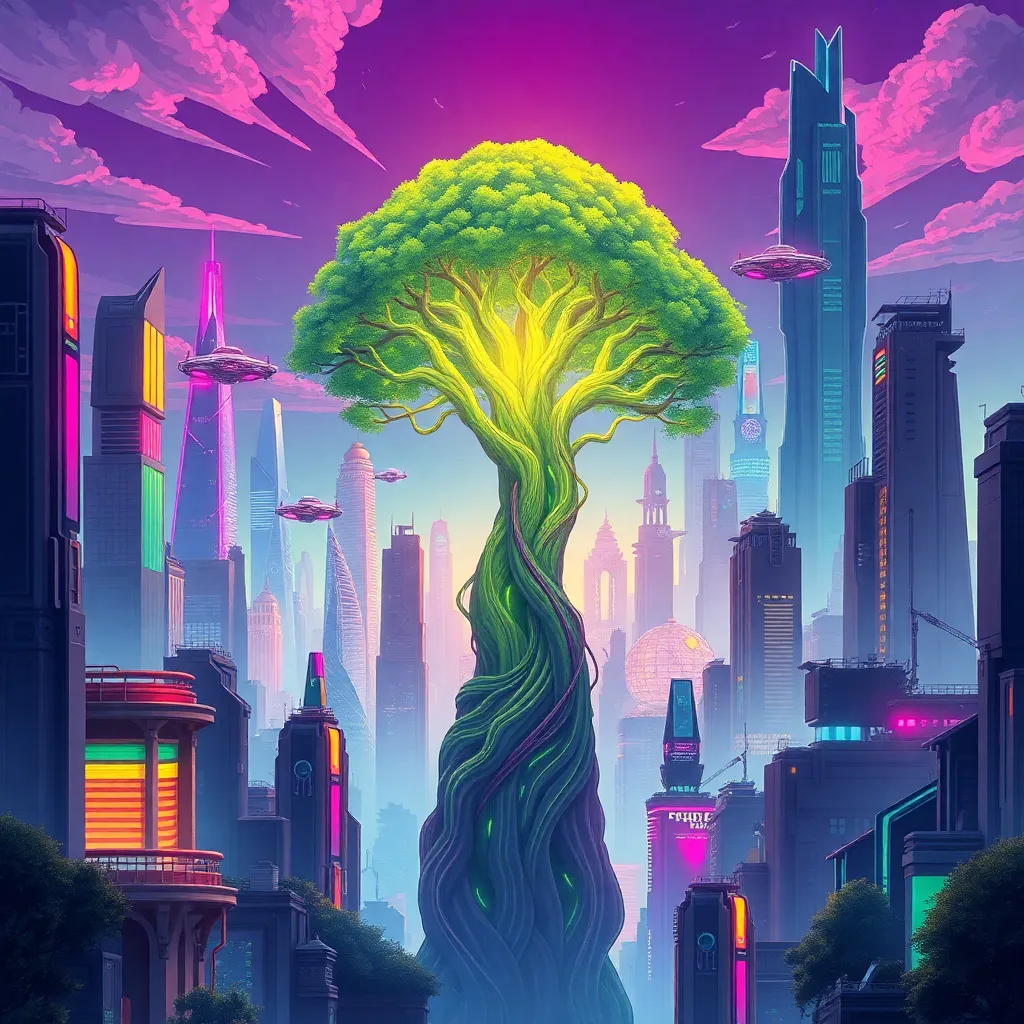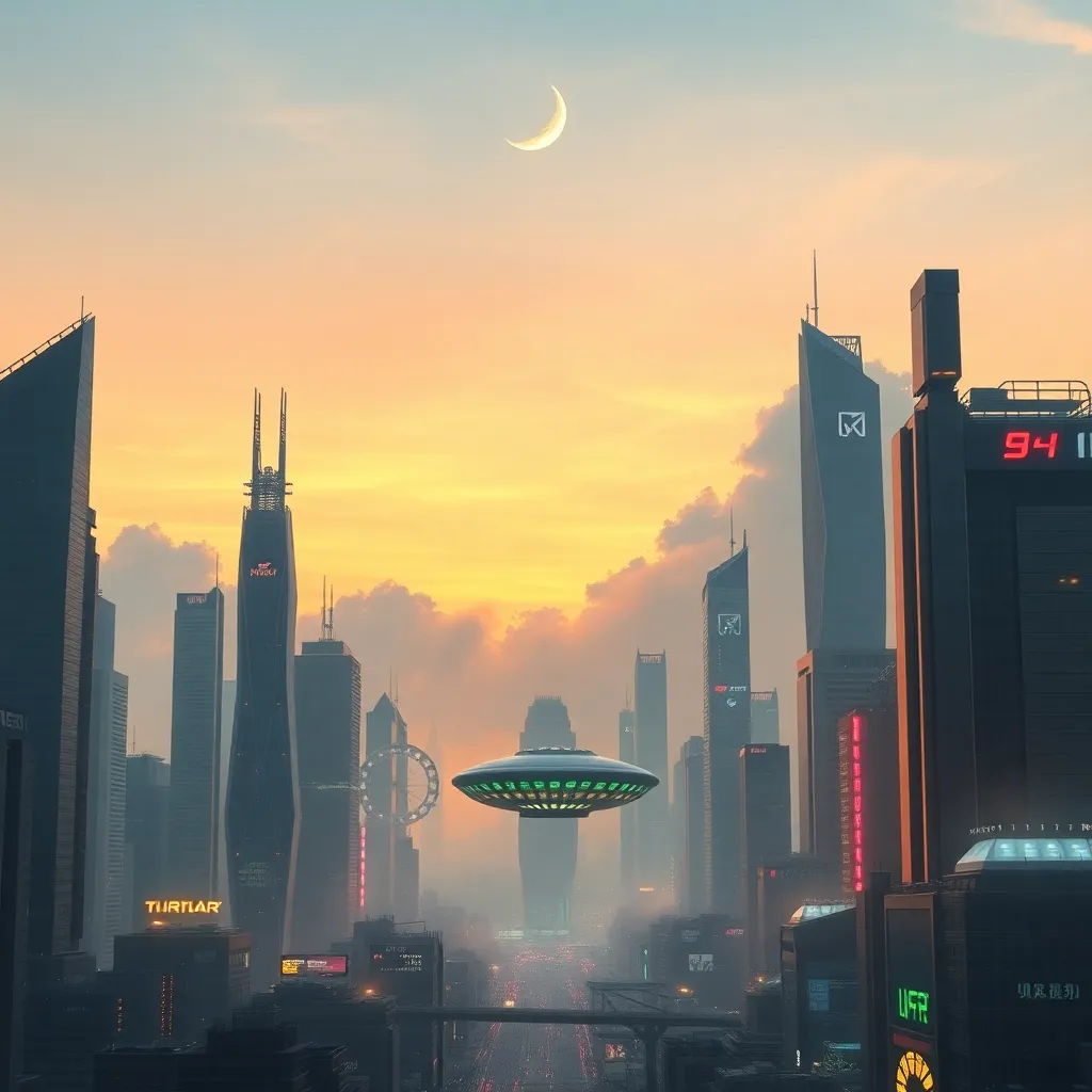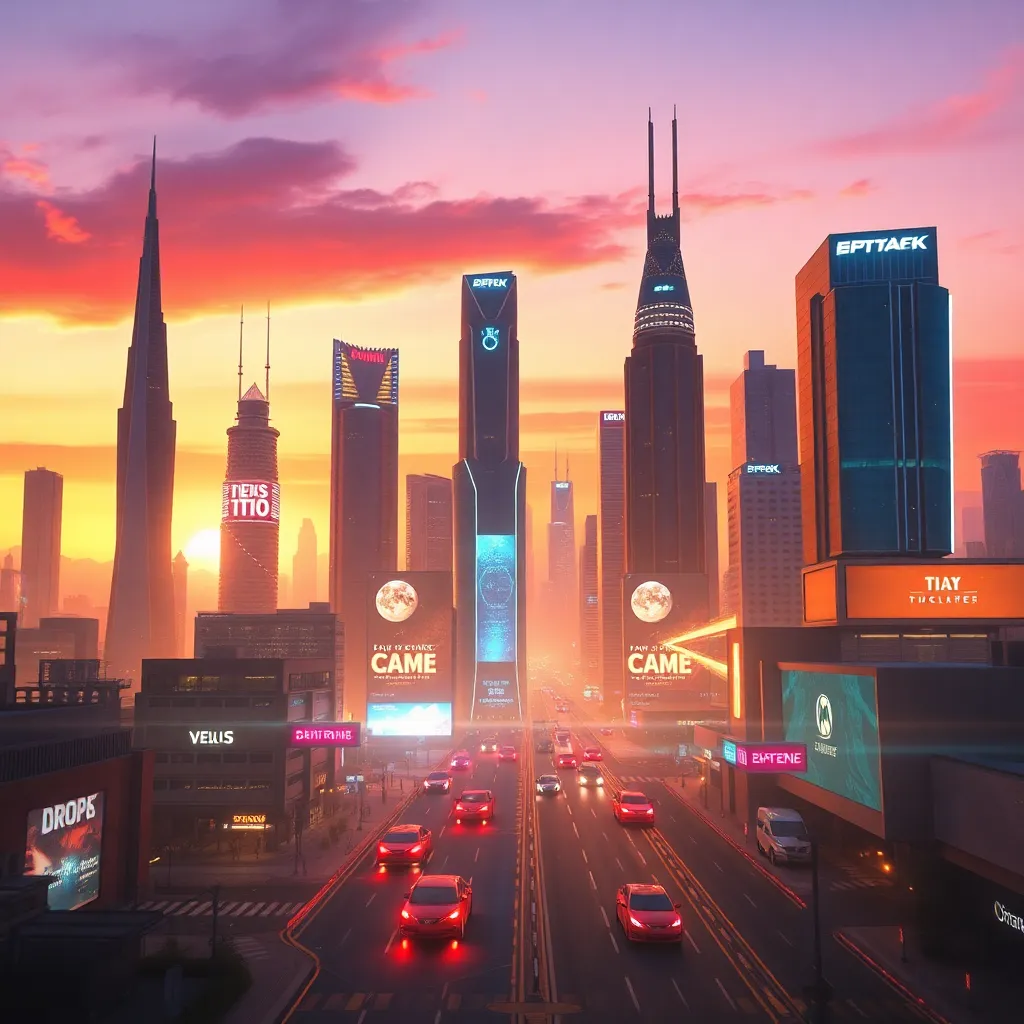 Create an imaginative futuristic cityscape at sunset, with sleek skyscrapers, neon-lit streets, and a sprawling metropolis that blends organic and synthetic elements. Incorporate vibrant colors, intricate details, and a sense of energy and movement. The city should be both futuristic and nostalgic, with a hint of mystique.