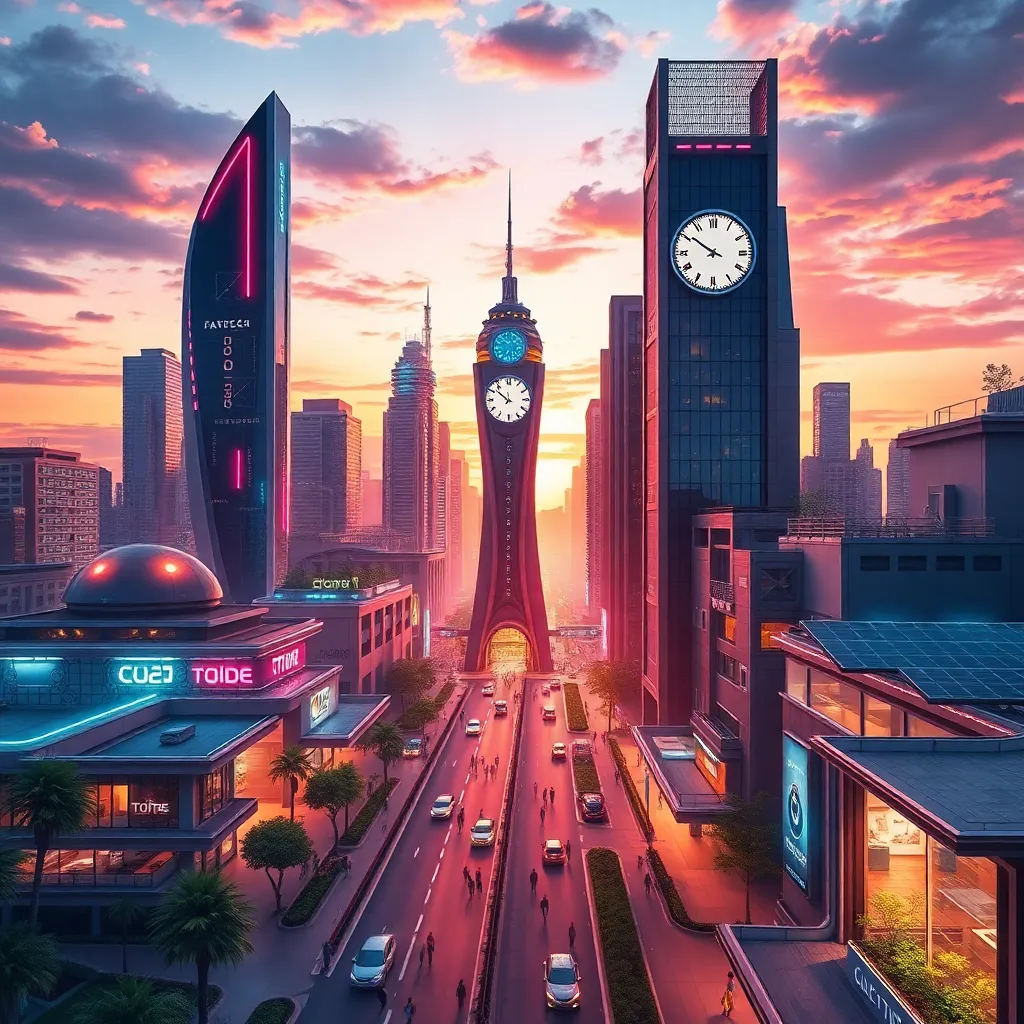 Design a futuristic cityscape with sleek skyscrapers, neon lights, and a vibrant atmosphere. Incorporate a prominent clock tower, a bustling street with pedestrians and vehicles, and a stunning sunset in the background. Add a touch of sustainability with greenery and solar panels. Make it a futuristic yet welcoming metropolis.