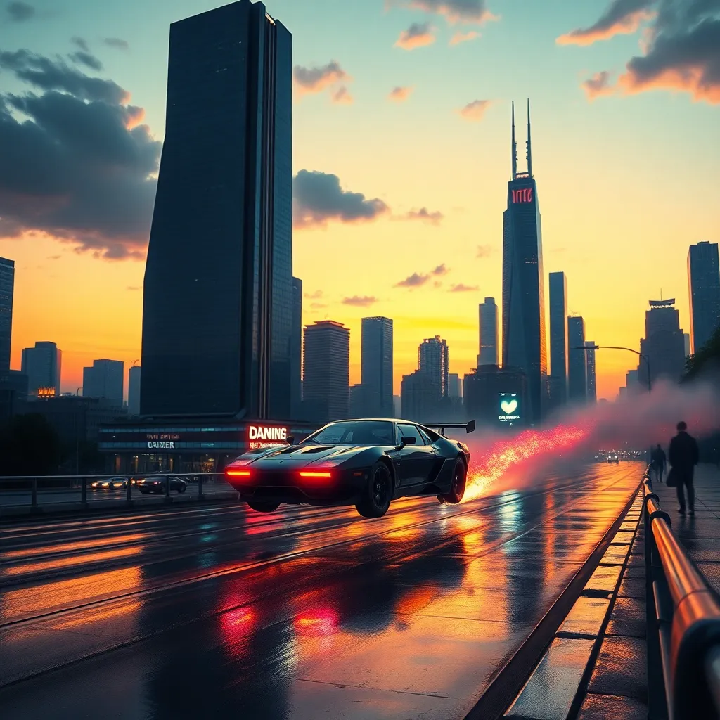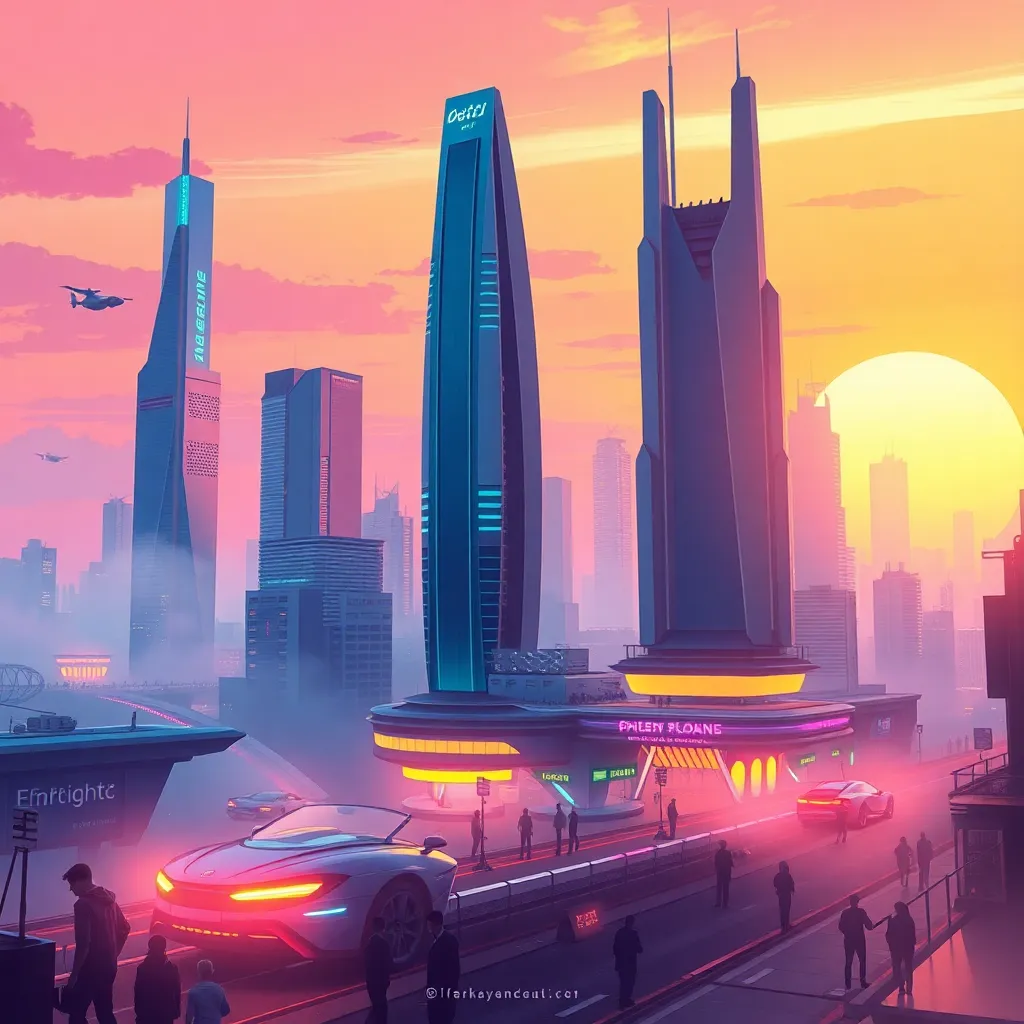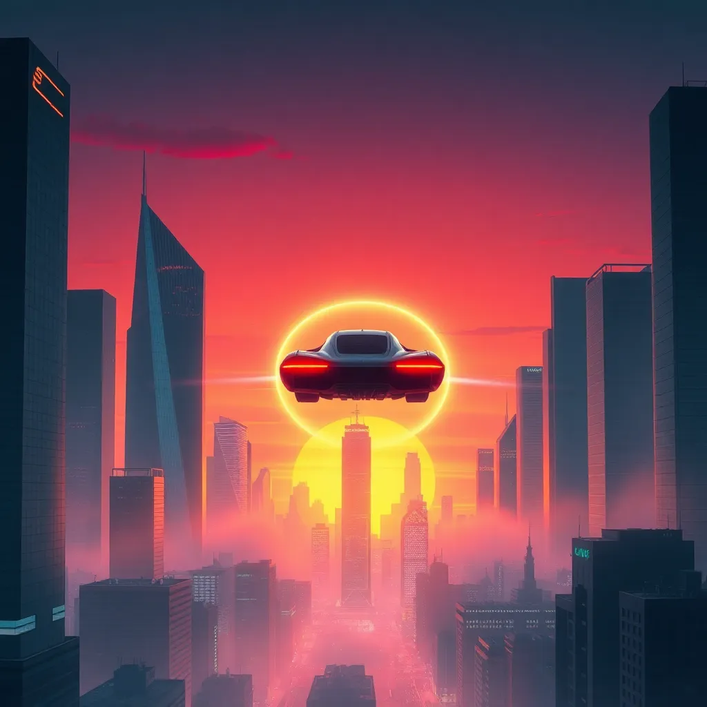 Create a futuristic cityscape at sunset, with sleek skyscrapers, neon lights, and a vibrant atmosphere. Incorporate a flying car hovering above the city, surrounded by a halo of light, with a subtle misty fog rolling in from the horizon. Use bold colors and striking lines to capture the dynamic energy.