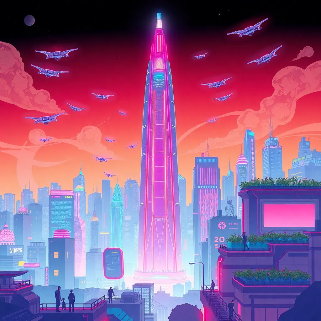 Create an illustration of a futuristic cityscape with a sleek, neon-lit skyscraper at its center. Incorporate hovering drones, flying cars, and humans walking on the rooftop gardens. The atmosphere should be vibrant and bustling, with a sense of innovation and progress. Use bold lines, bright colors, and dynamic composition.
