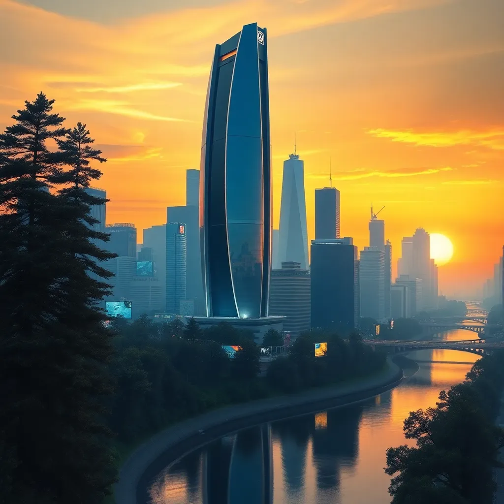 Create an image of a futuristic cityscape at sunset with a sleek, silver skyscraper in the center, surrounded by towering trees and a winding river. The sky should be a warm orange-yellow color with a few wispy clouds. Incorporate subtle neon lights and holographic advertisements to give the scene a futuristic feel.