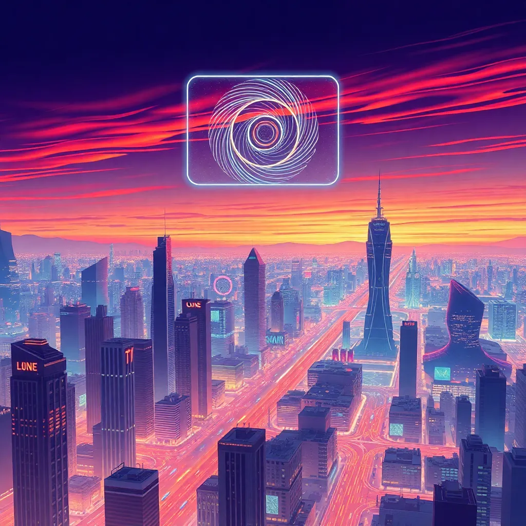 Create an illustration of a futuristic cityscape at sunset, featuring a sprawling metropolis with sleek skyscrapers, neon-lit streets, and a vibrant atmosphere. Incorporate a subtle holographic display hovering above the city, with a mesmerizing pattern of swirling colors and lights. The scene should exude a sense of innovation and progress.