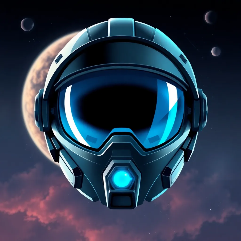 "Create an illustration of a futuristic space explorer's helmet, with a glowing blue visor, silver accents, and a sleek design. The helmet should be surrounded by a subtle nebula background with stars and planets in the distance. Incorporate a sense of adventure and discovery in the overall aesthetic.