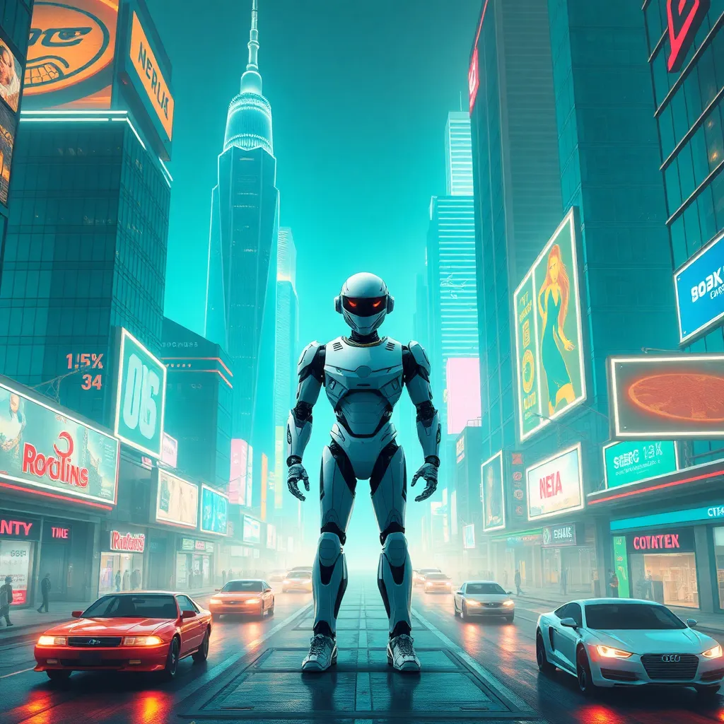 Create an futuristic cityscape with sleek skyscrapers, neon lights, and a bustling streets. Incorporate a humanoid robot standing in the center, surrounded by holographic advertisements and flying cars zipping by. The atmosphere should be vibrant and energetic, with a hint of nostalgia for a retro-futuristic era.