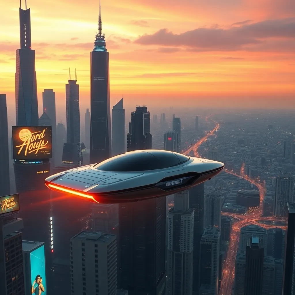 Create an futuristic cityscape at sunset with towering skyscrapers, neon-lit billboards, and a sprawling metropolis in the distance. Incorporate a sleek, high-tech hovercar hovering above the city, with a vibrant orange glow emanating from its underside. The sky should be a warm blend of orange, pink, and purple hues.