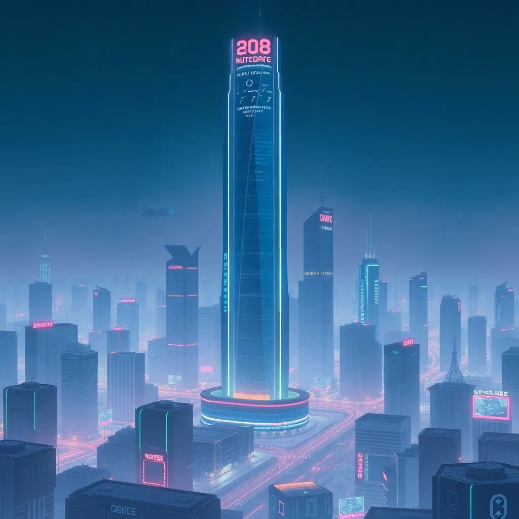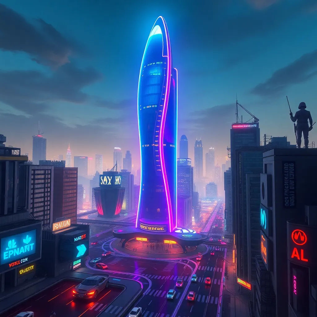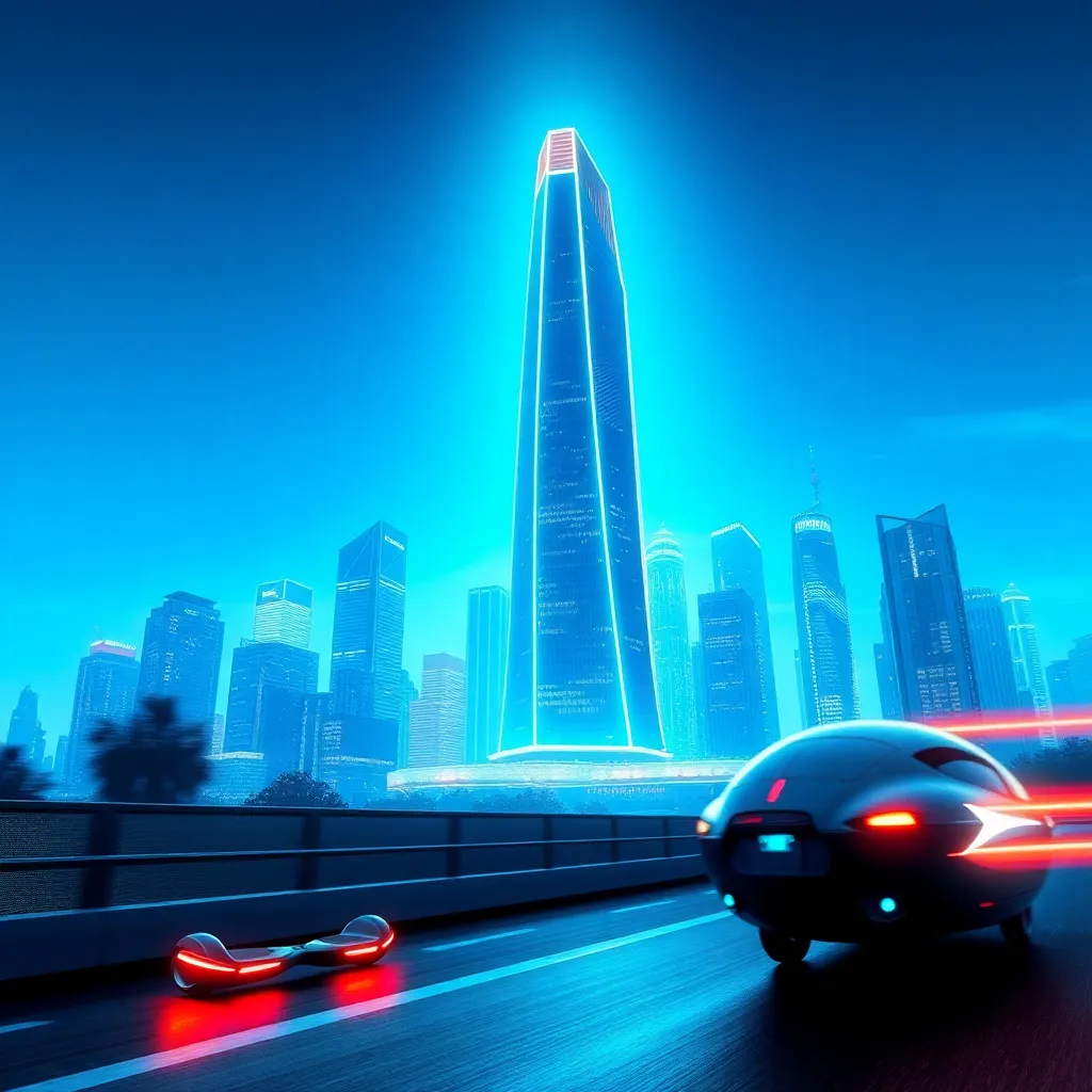 Create a futuristic cityscape with a sleek, neon-lit skyscraper at its center. Incorporate a hoverboard and a futuristic vehicle zipping by. Add a vibrant, electric blue hue to the sky and a subtle glow to the building's edges. The atmosphere should be energetic and dynamic, conveying a sense of innovation and progress.