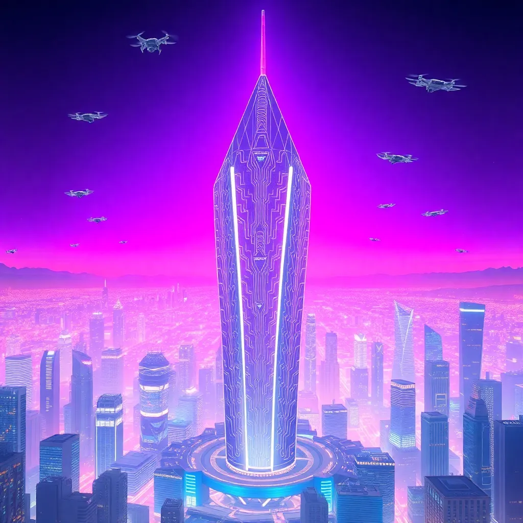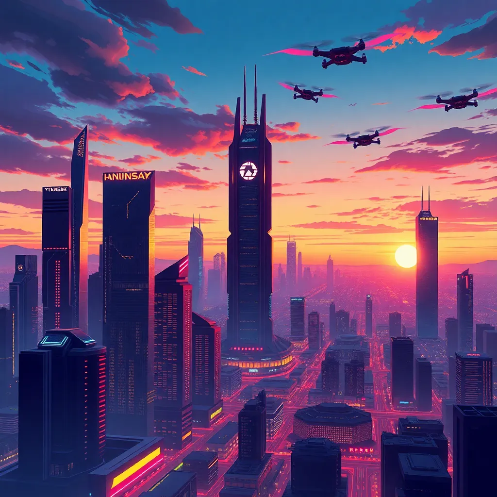Create an illustration of a futuristic cityscape at sunset, with sleek skyscrapers, neon lights, and a sprawling metropolis. Incorporate a prominent central building with a glowing logo, and a few flying drones or hover cars in the sky. The atmosphere should be vibrant and energetic, with a sense of innovation and progress.
