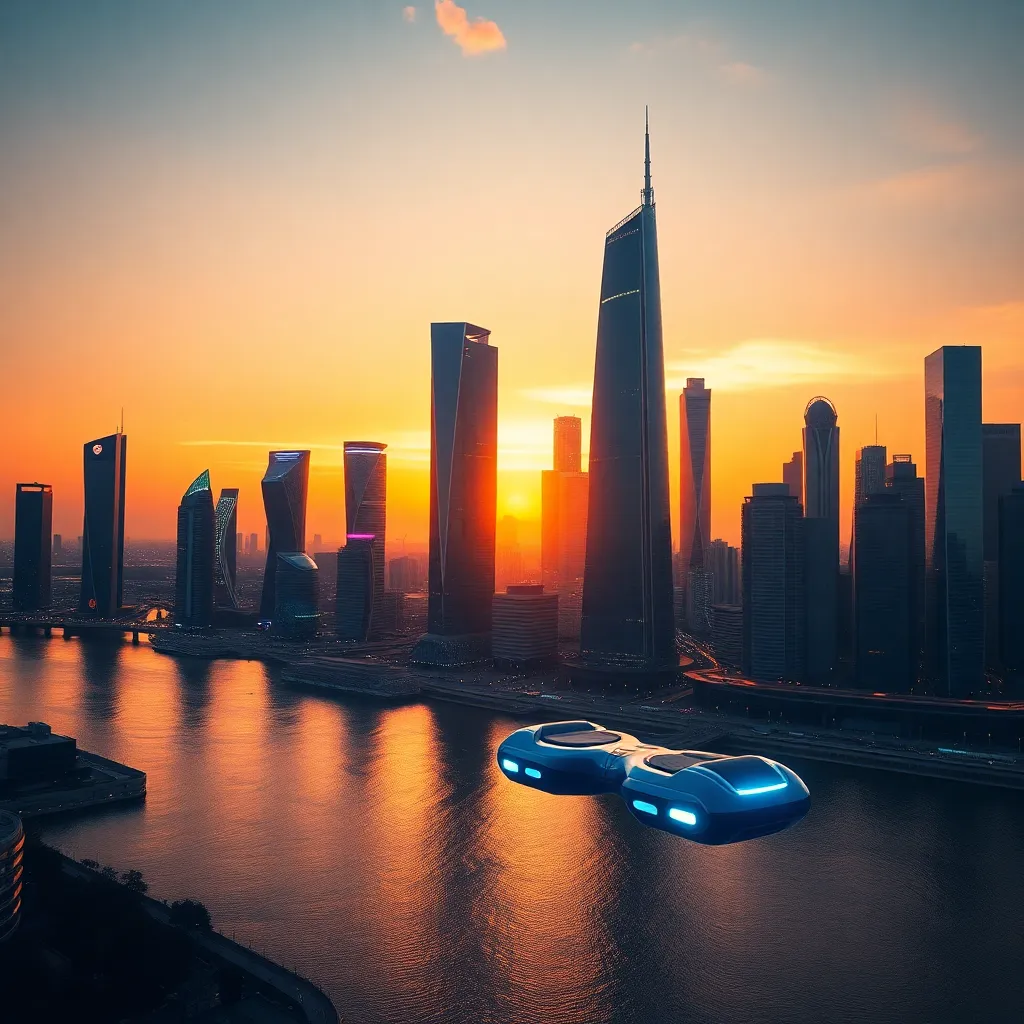Create an image of a futuristic cityscape at sunset, with sleek skyscrapers and neon lights reflecting off the water. Incorporate a hoverboard or flying car in the foreground, and add a subtle glow to the city's infrastructure. The atmosphere should be vibrant and energetic, with a sense of innovation and progress.