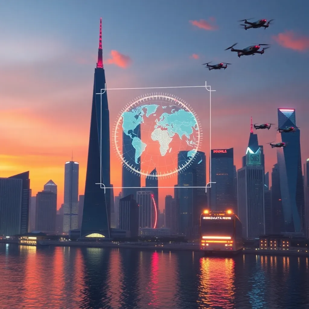 Create an image of a futuristic cityscape at sunset, with sleek skyscrapers and neon lights reflecting off the water. Incorporate a subtle holographic display hovering above the city, displaying a futuristic map or navigation system. Include a few flying cars and drones zipping by, adding to the sense of technological advancement.