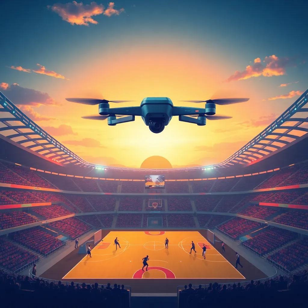 "Create an illustration of a futuristic sports stadium at sunset, with a Veo camera drone flying overhead, capturing a thrilling basketball game in action. Incorporate vibrant colors, dynamic lighting, and a sense of energy and excitement, showcasing the cutting-edge technology of Veo's sports video analysis system.