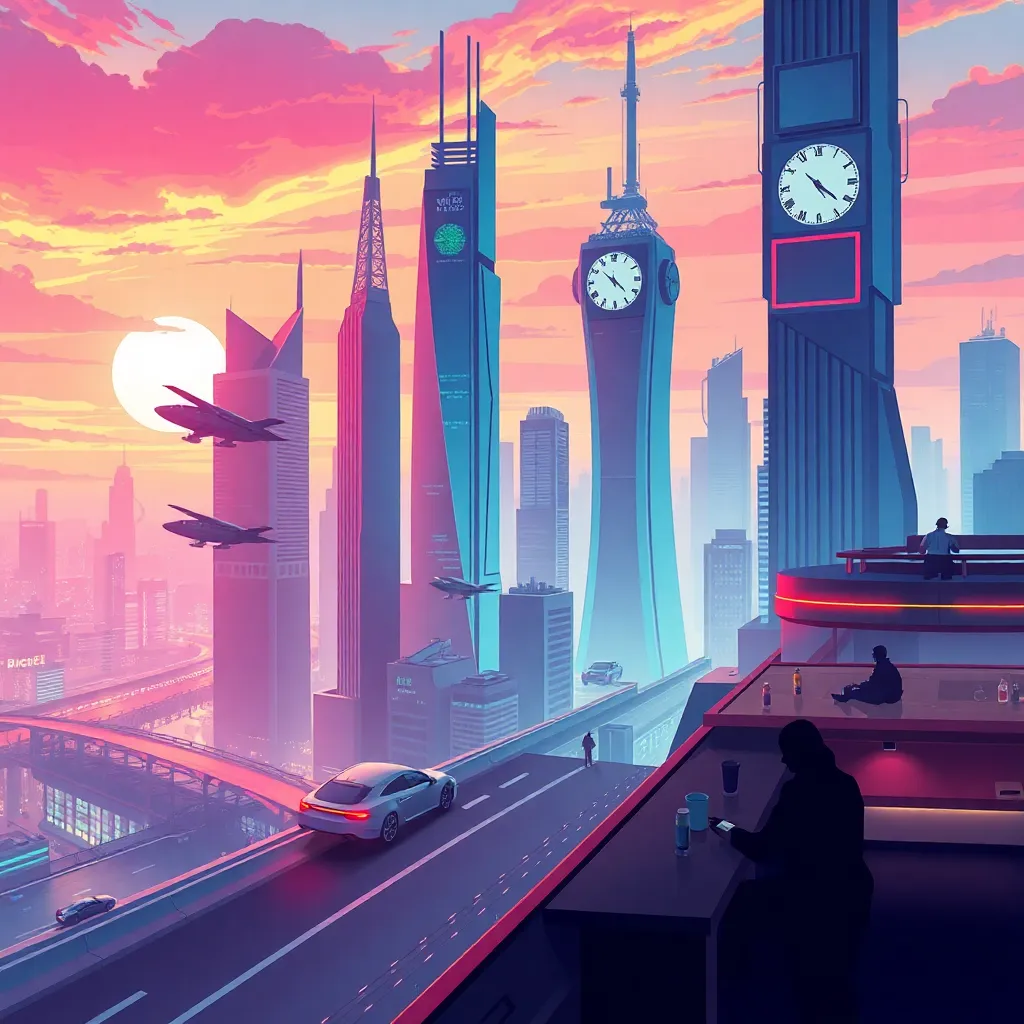 Create an illustration of a futuristic cityscape at sunset, with sleek skyscrapers, flying cars, and humans enjoying leisure activities. Incorporate vibrant colors, neon lights, and a sense of calmness. The city should be surrounded by a futuristic landscape with towering mountains and a glowing atmosphere.