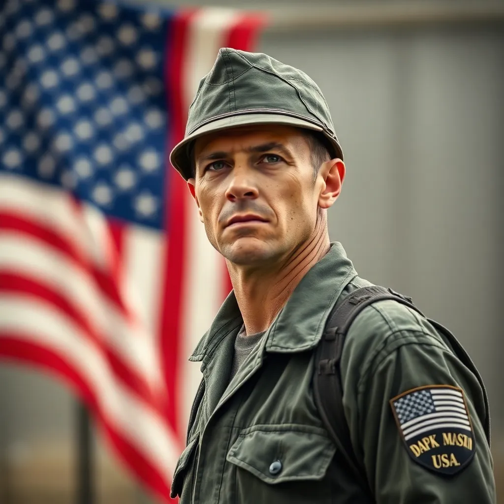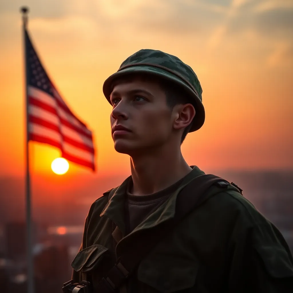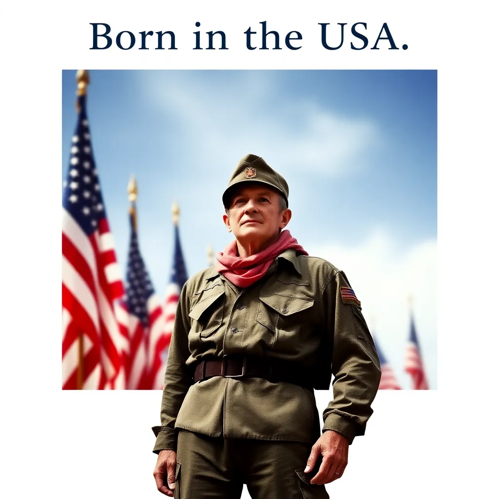 Capture the essence of Bruce Springsteen's iconic song 'Born in the USA' in a vivid AI-generated image. Depict a young American soldier, perhaps a Vietnam veteran, standing proudly in a patriotic setting, surrounded by symbols of freedom and the American flag, conveying a sense of resilience and hope.