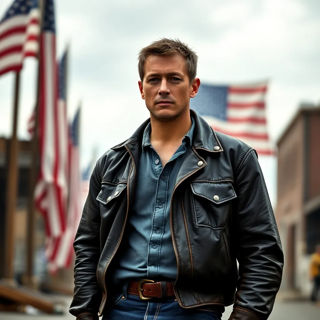 Create an image that captures the essence of Bruce Springsteen's iconic song 'Born in the USA'. Depict a young American soldier, perhaps a veteran, standing proudly with a worn leather jacket, jeans, and a determined gaze, set against a gritty urban or patriotic backdrop, symbolizing resilience and freedom.
