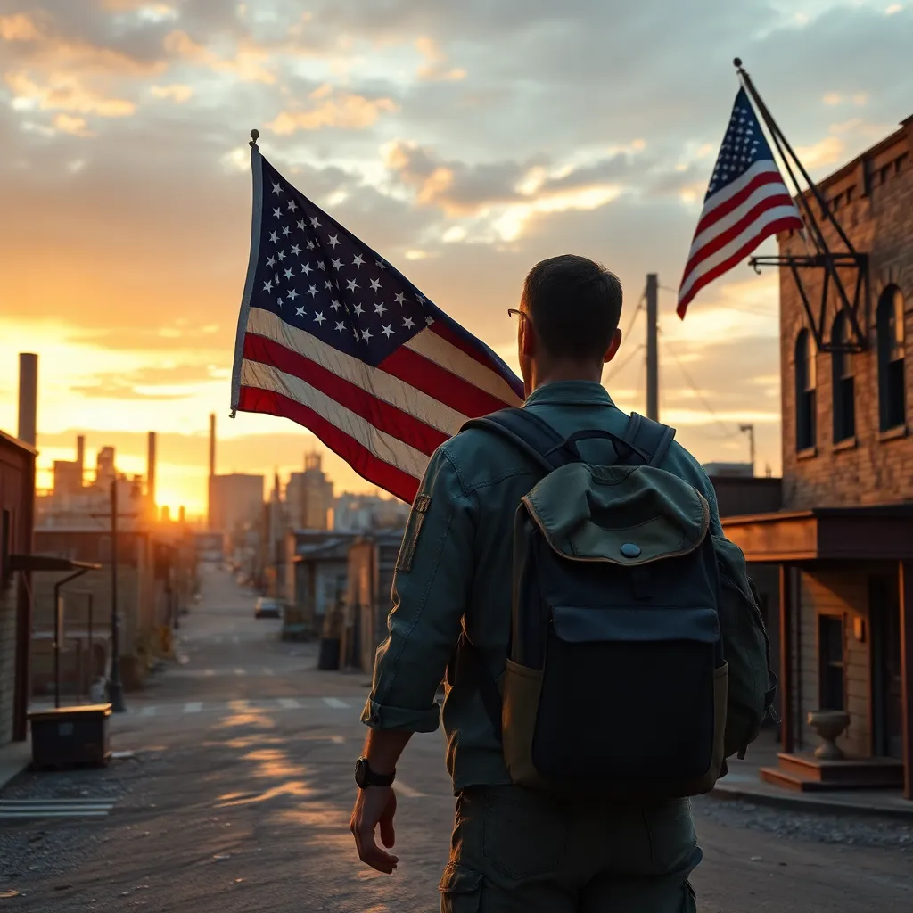 Create an AI image that captures the essence of Bruce Springsteen's iconic song 'Born in the USA'. Depict a gritty, small-town American scene with a young veteran returning home, perhaps with a faded flag or a worn-out backpack, against a backdrop of worn-down streets, rusty factories, and a cityscape at sunset.
