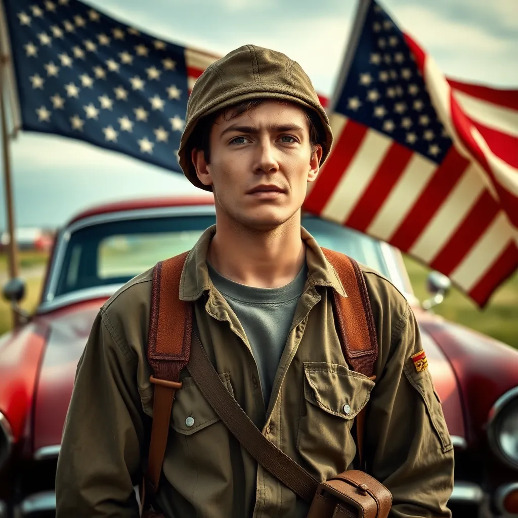 Create an image that captures the essence of Bruce Springsteen's iconic song 'Born in the USA'. Depict a young American soldier returning home from war, standing in front of a classic American car, with a worn-out flag and a mix of emotions on his face, conveying a sense of patriotism and disillusionment.