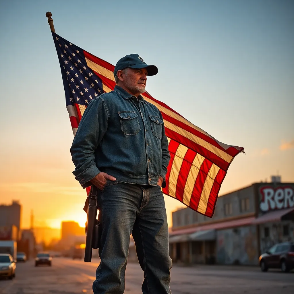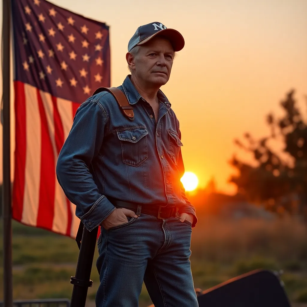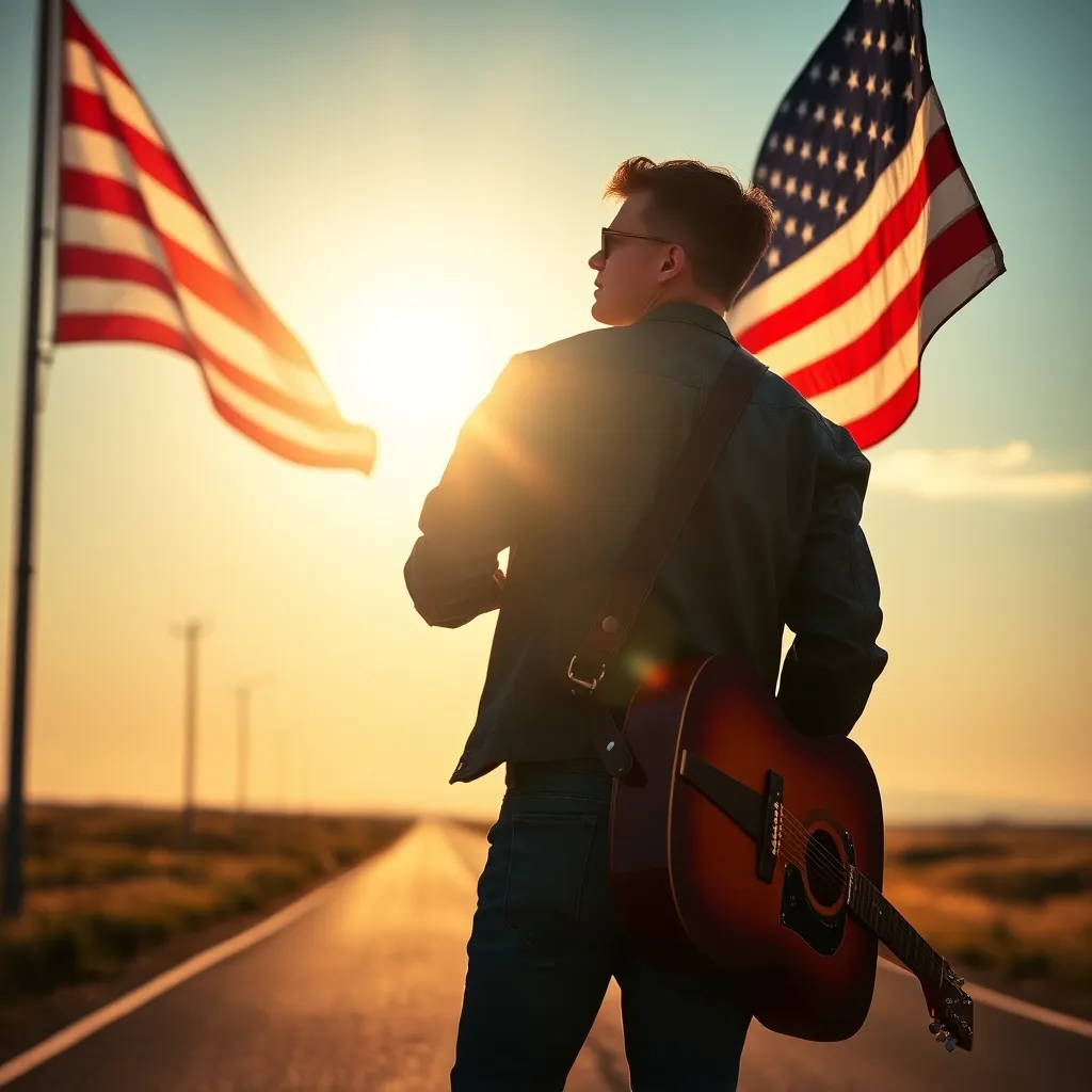 Create an AI-generated image depicting a nostalgic summer evening in 1980s America. A worn denim-clad Vietnam veteran, baseball cap on, stands proudly in front of a faded American flag, with a guitar slung over his shoulder and a guitar case at his feet. The sun sets behind him, casting a warm orange glow.