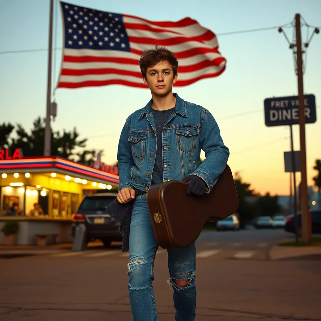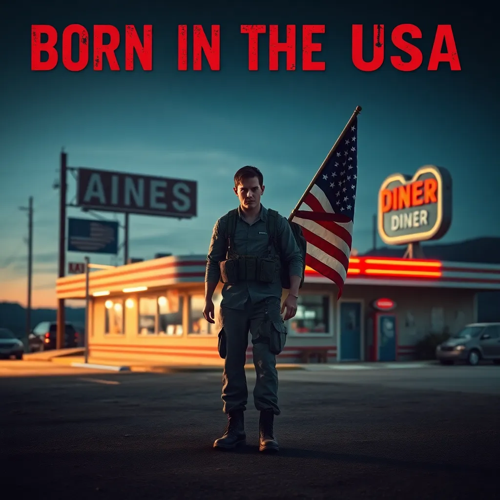 Create an AI image inspired by Bruce Springsteen's iconic song 'Born in the USA'. Depict a gritty, American landscape with a worn-down, small-town diner or gas station in the background. Include a lone figure, perhaps a young soldier, standing proudly in the foreground, with a flag or a backpack, symbolizing freedom and rebellion.