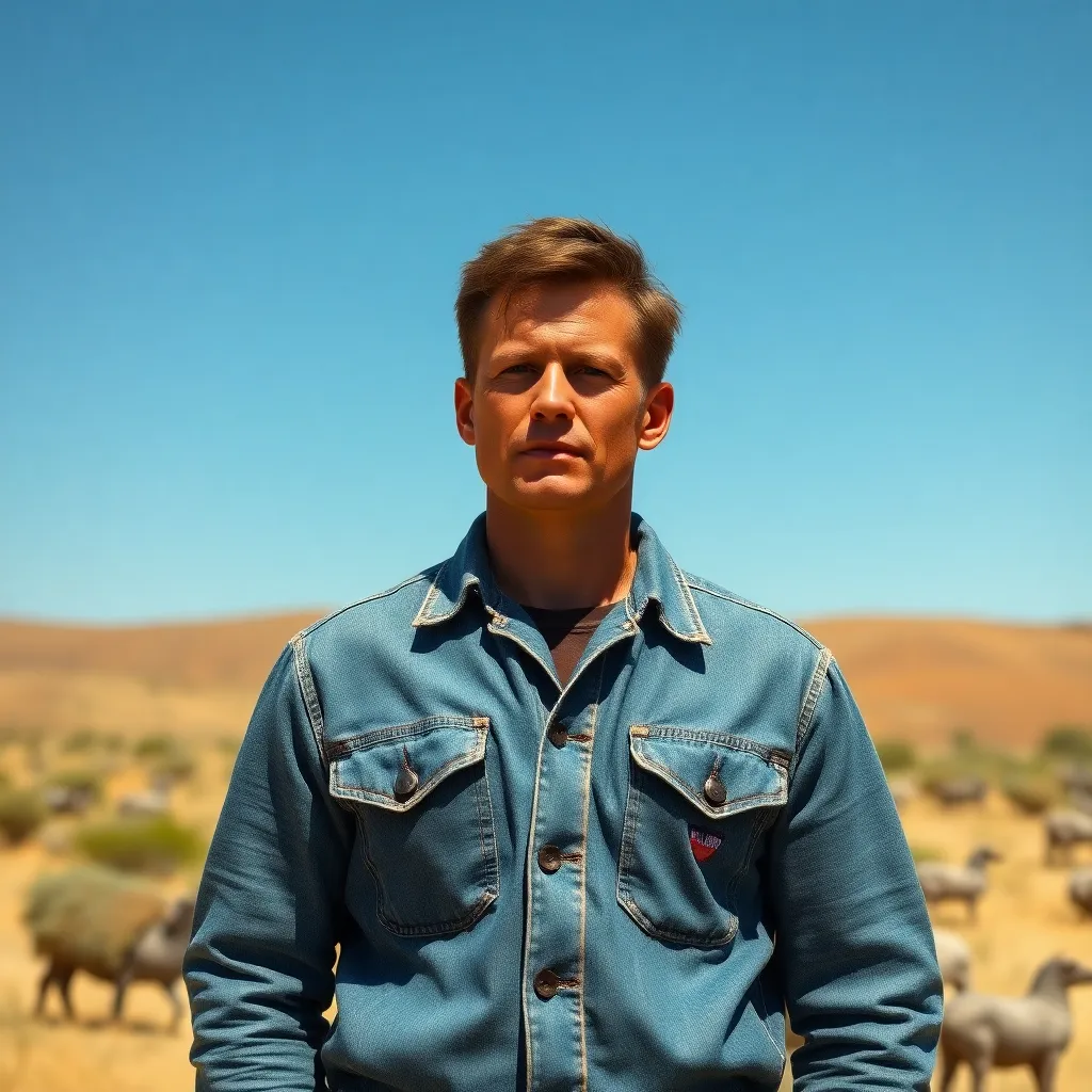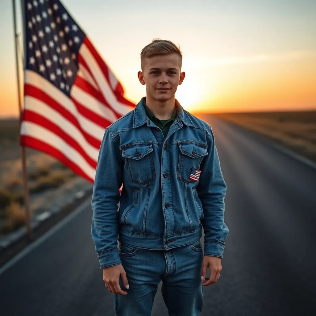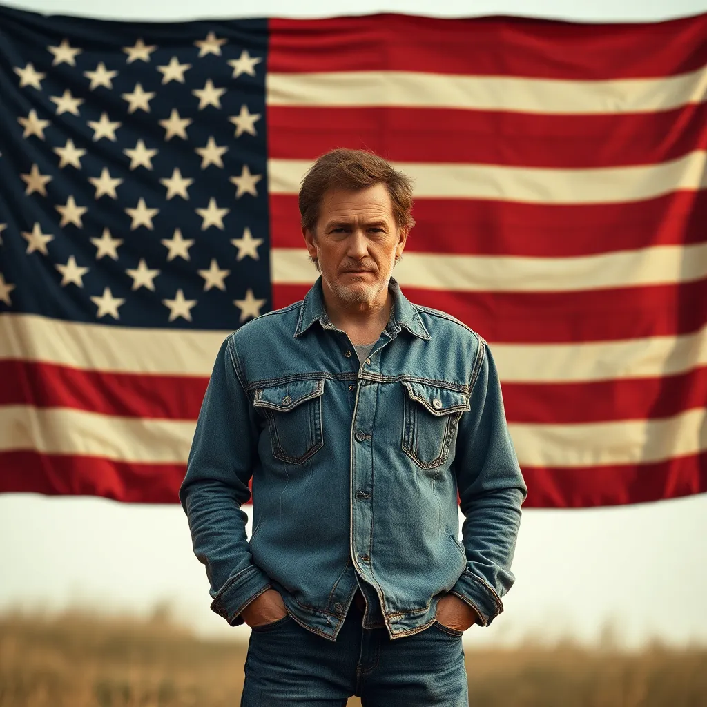 Create an AI-generated image that captures the essence of Bruce Springsteen's iconic song 'Born in the USA'. Depict a young American soldier, perhaps a Vietnam War veteran, standing proudly in a sun-kissed landscape, with a worn denim jacket and a determined expression, symbolizing resilience and patriotism.