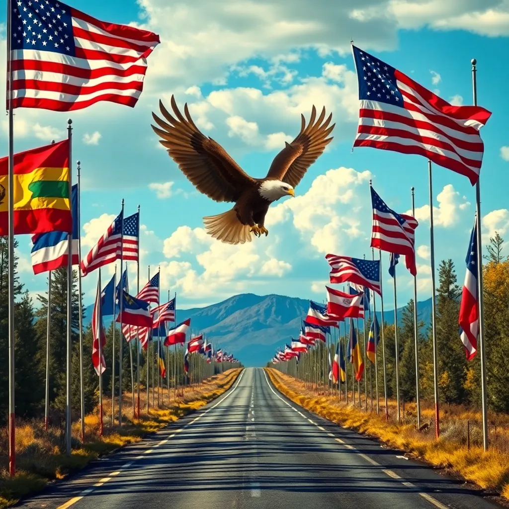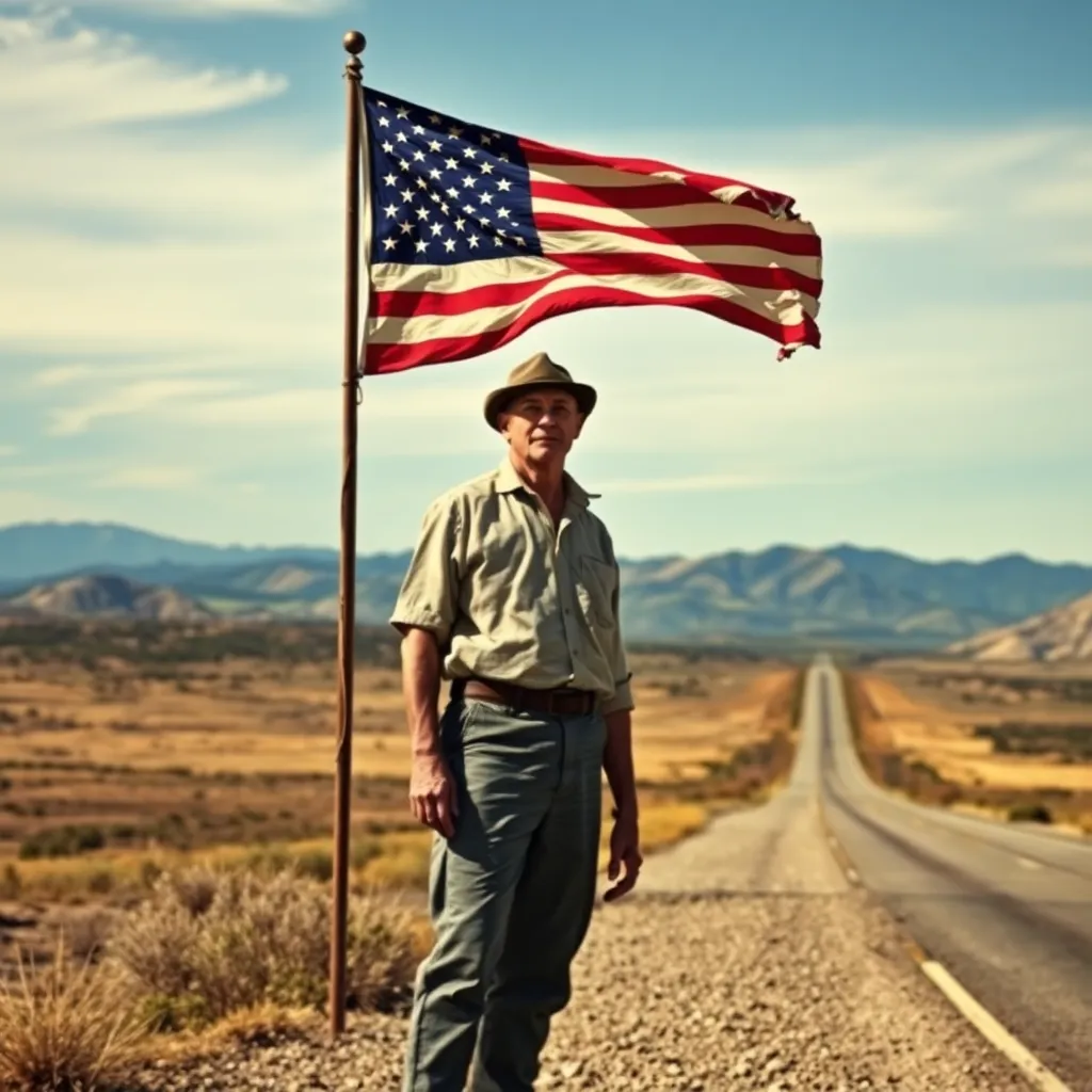 Create an image that captures the essence of Bruce Springsteen's iconic song 'Born in the USA'. Depict a nostalgic American landscape with a faded American flag waving in the wind, a worn-out Vietnam War veteran standing proudly, and a distant highway stretching out to the horizon, symbolizing freedom and resilience.