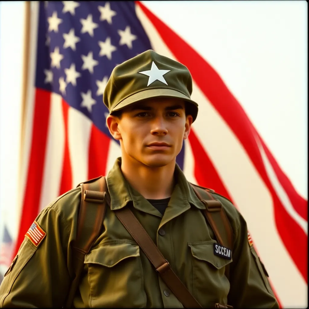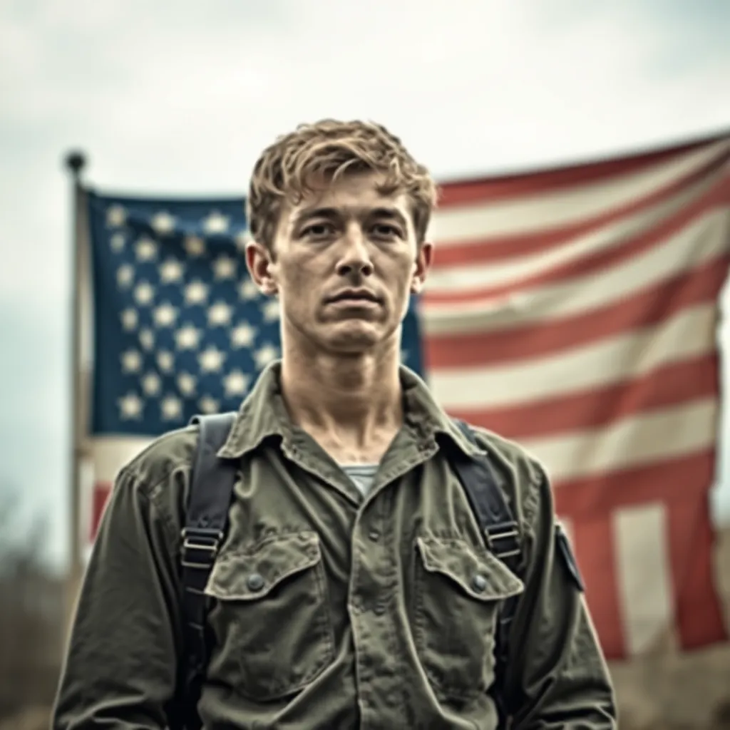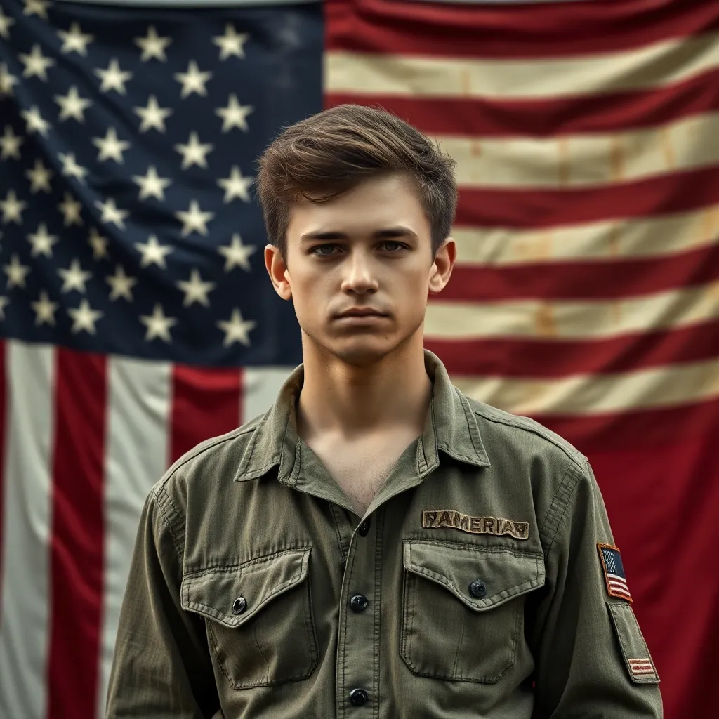 Create an AI-generated image of a young American soldier, dressed in casual clothing, standing in front of a faded American flag, with a nostalgic expression, capturing the essence of Bruce Springsteen's iconic song 'Born in the USA'. Incorporate subtle elements of patriotism, freedom, and a hint of melancholy.