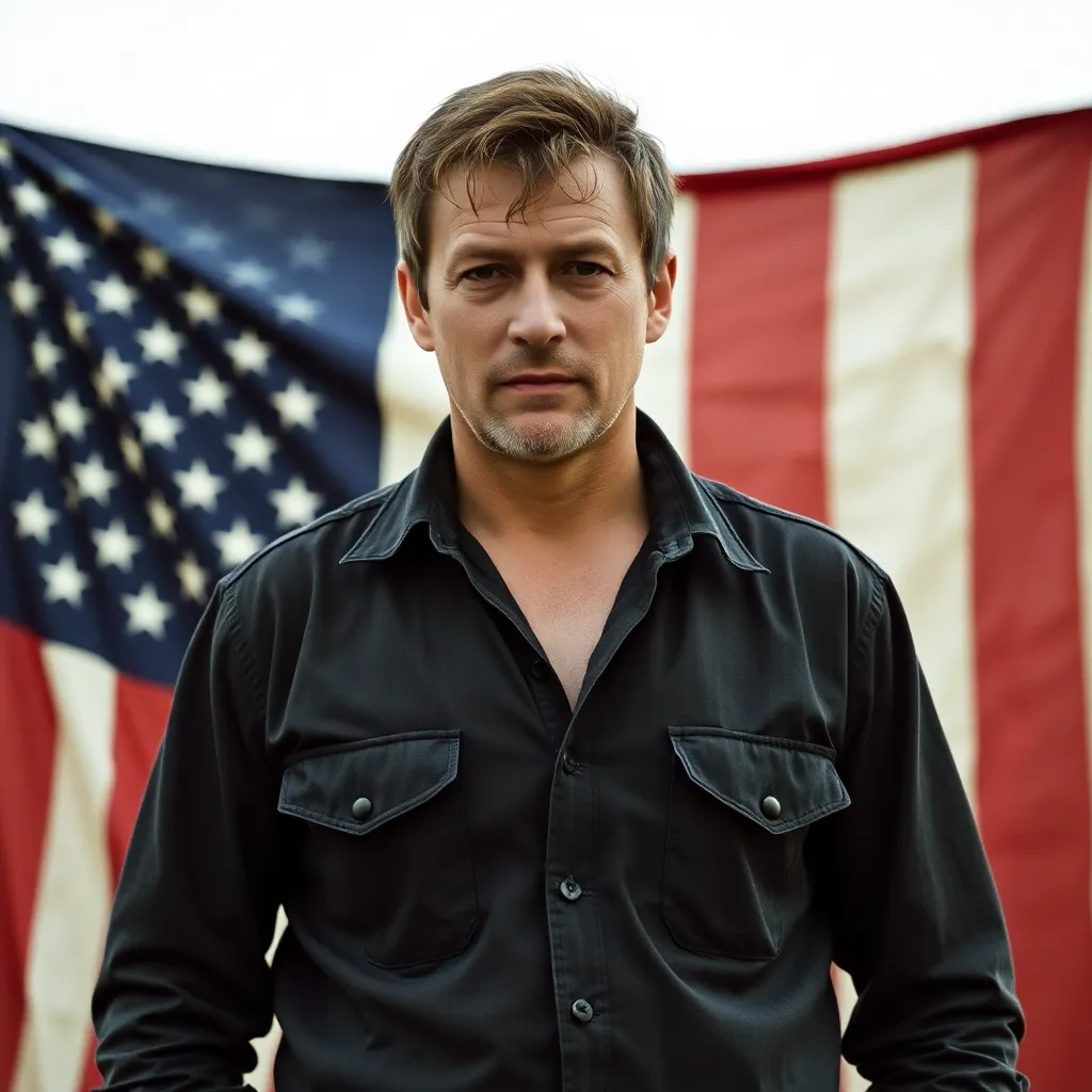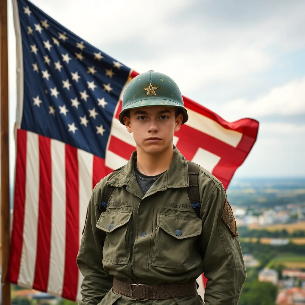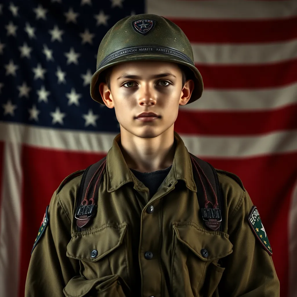 Create an AI-generated image of a young American soldier, dressed in casual clothing, standing in front of a faded American flag, with a nostalgic expression, capturing the essence of Bruce Springsteen's iconic song 'Born in the USA'. Incorporate subtle elements of patriotism, freedom, and a hint of melancholy.