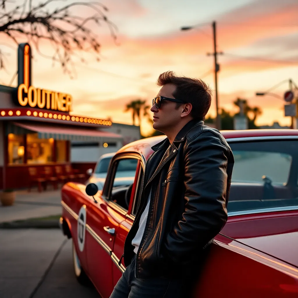 Capture the essence of Bruce Springsteen's iconic song 'Born in the USA'. Imagine a nostalgic summer evening in a small American town, with a retro-style diner and a 1950s-style car parked outside. A young man in a leather jacket and sunglasses is leaning against the car, looking out at the horizon.