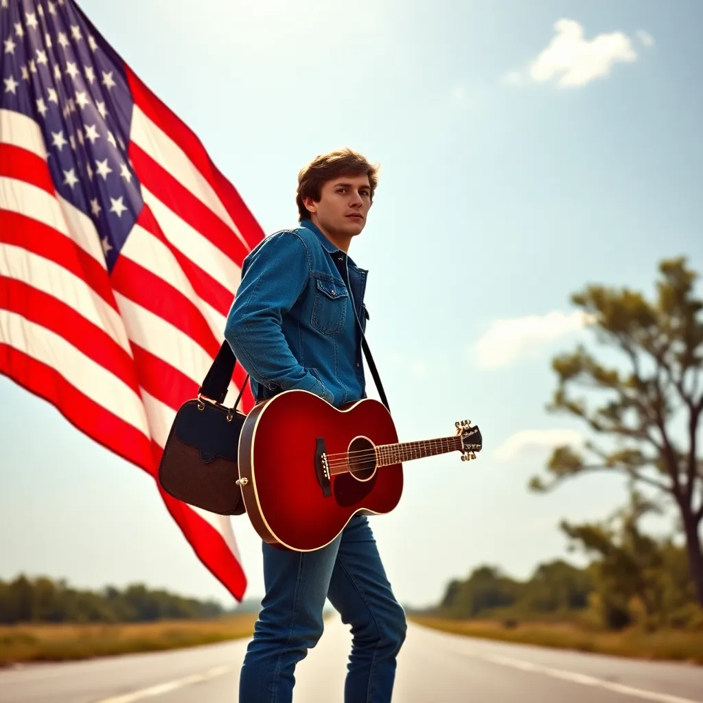Summer 1984, a sun-kissed American flag waves proudly as a young man, dressed in a denim jacket and jeans, stands confidently with a guitar slung over his shoulder, gazing out at the open road. Capture the essence of Bruce Springsteen's iconic song 'Born in the U.S.A.' in a nostalgic, high-contrast image.