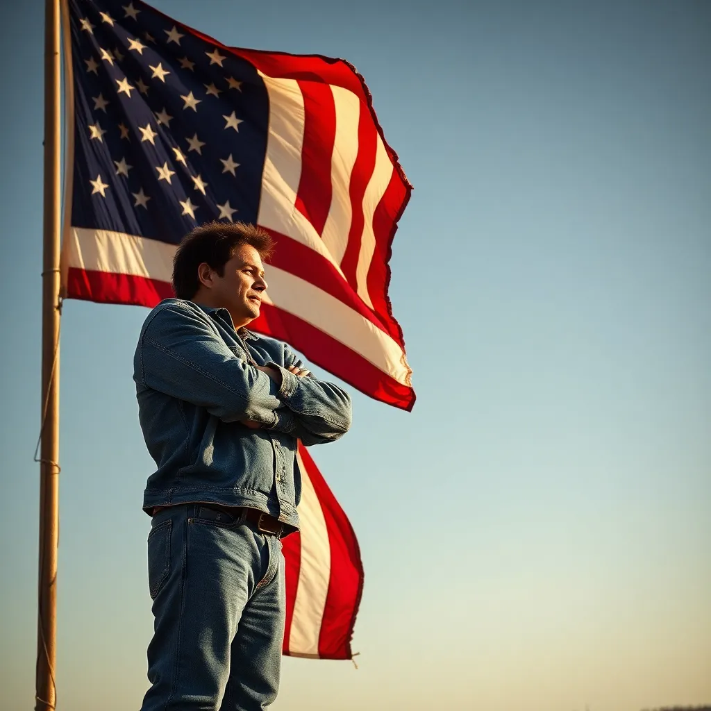 Capture the essence of Bruce Springsteen's iconic song 'Born in the USA' in a single image. Depict a worn, nostalgic American flag waving in the wind, with a faded denim-clad figure standing proudly in the foreground, arms crossed, looking out at the horizon. Convey a sense of patriotism and longing.