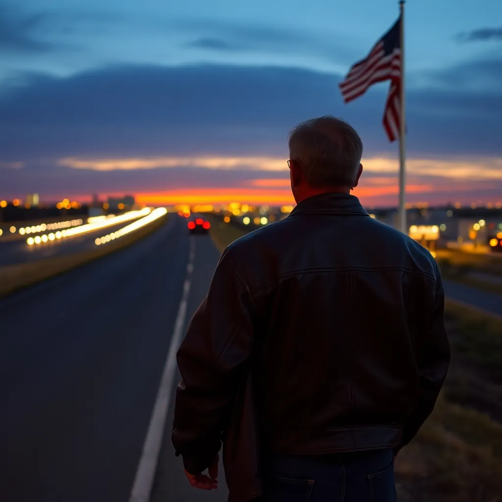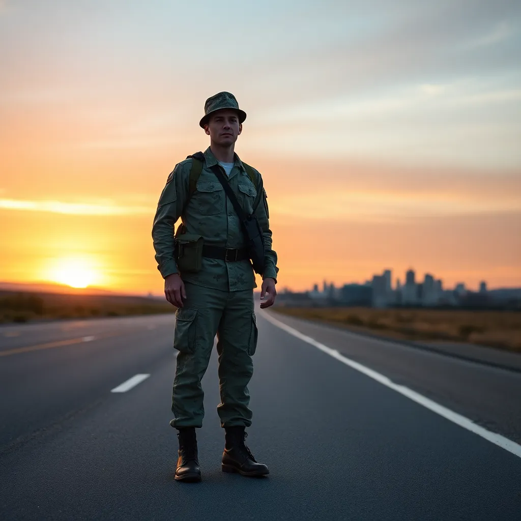 Create an image that captures the essence of Bruce Springsteen's iconic song 'Born in the USA'. Depict a young American soldier, perhaps in uniform, standing alone on a desolate highway, with a sunset or cityscape in the background. Incorporate elements of nostalgia, freedom, and the American Dream.