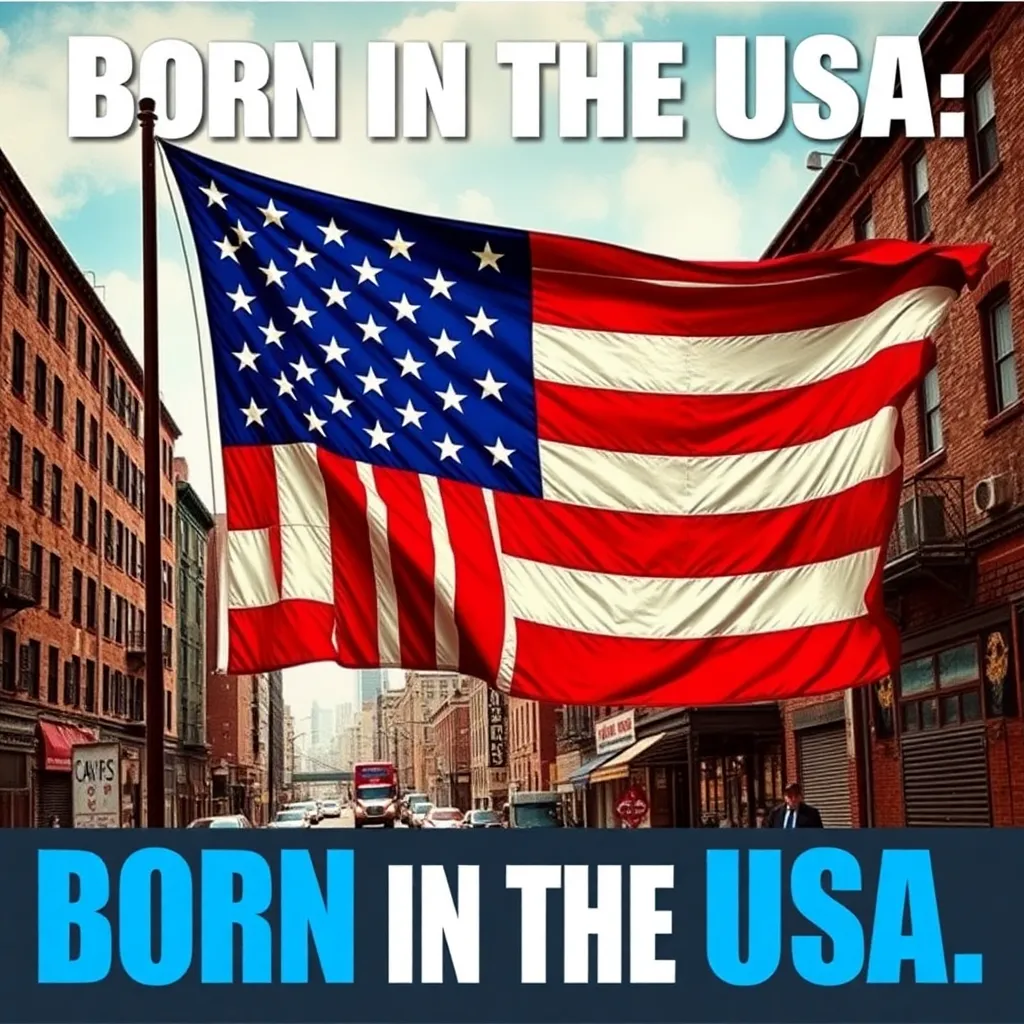 Create an image that captures the essence of Bruce Springsteen's iconic song 'Born in the USA'. Depict a symbol of American pride, such as the American flag, alongside a nostalgic and gritty urban landscape, evoking feelings of patriotism, rebellion, and the struggles of the working class. Incorporate bold colors and textures.